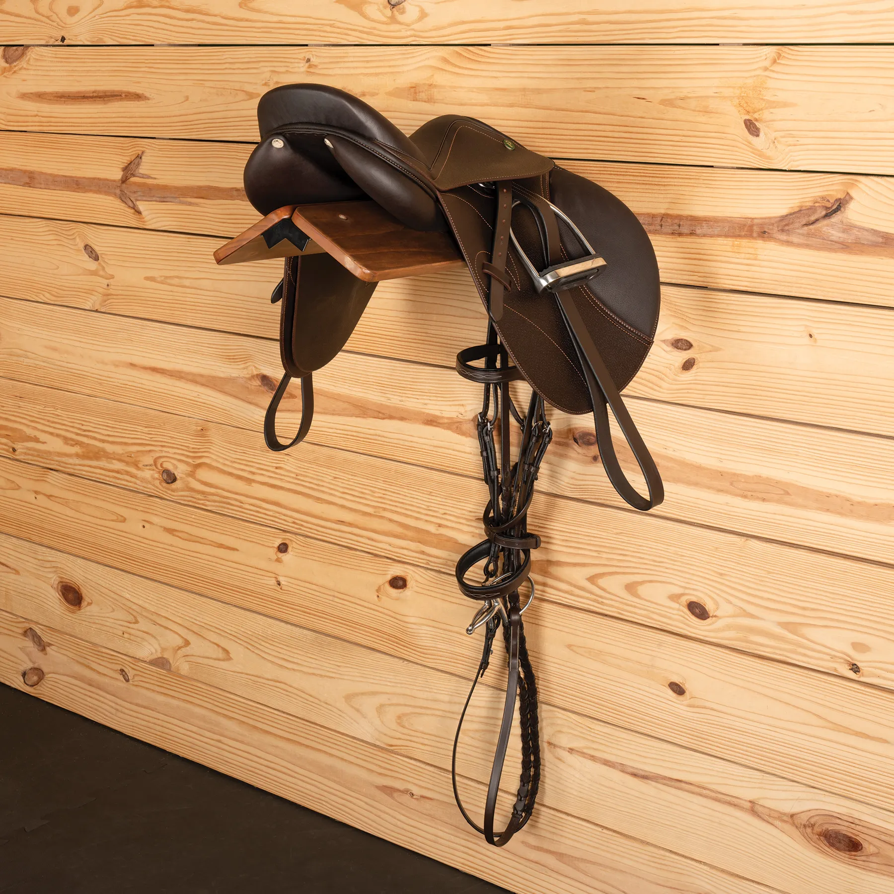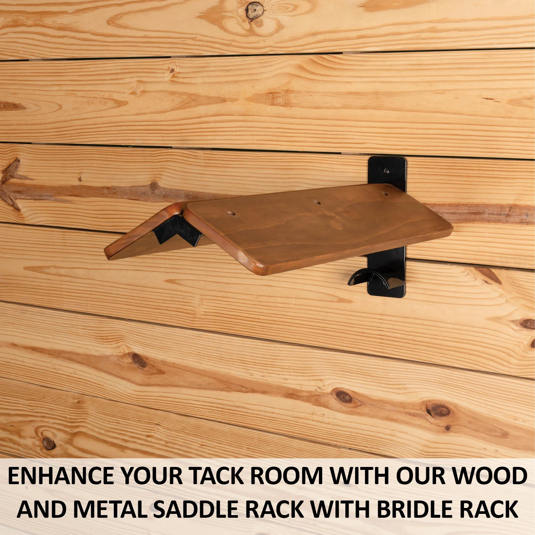 Upgrade your tack room with this mounted wood saddle rack with a bridle hook. This rack is crafted from solid pine wood and heavy-duty steel, designed to securely store your saddle while adding a touch of rustic charm. It features a convenient bridle hook beneath the rack to organize your bridles, halters, and more. Its smooth walnut-stained finish elevates the look of any equestrian space, making it an ideal choice for both functionality and aesthetics.