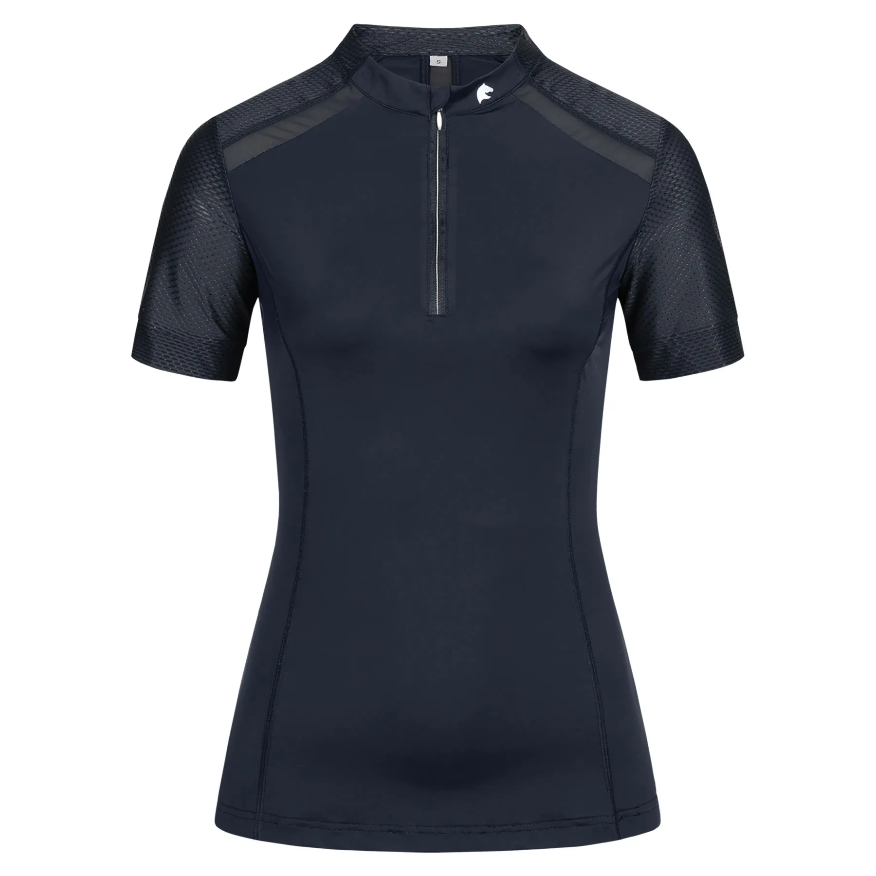 Stay cool, stylish, and comfortable in the saddle with this short sleeve 1/4 zip shirt built for active riders. Made from breathable technical fabric with mesh honeycomb inserts on the shoulders and back, it's designed to move with you while keeping you fresh. Finished with a glittering logo and tailored fit, this top is as fashionable as it is functional.