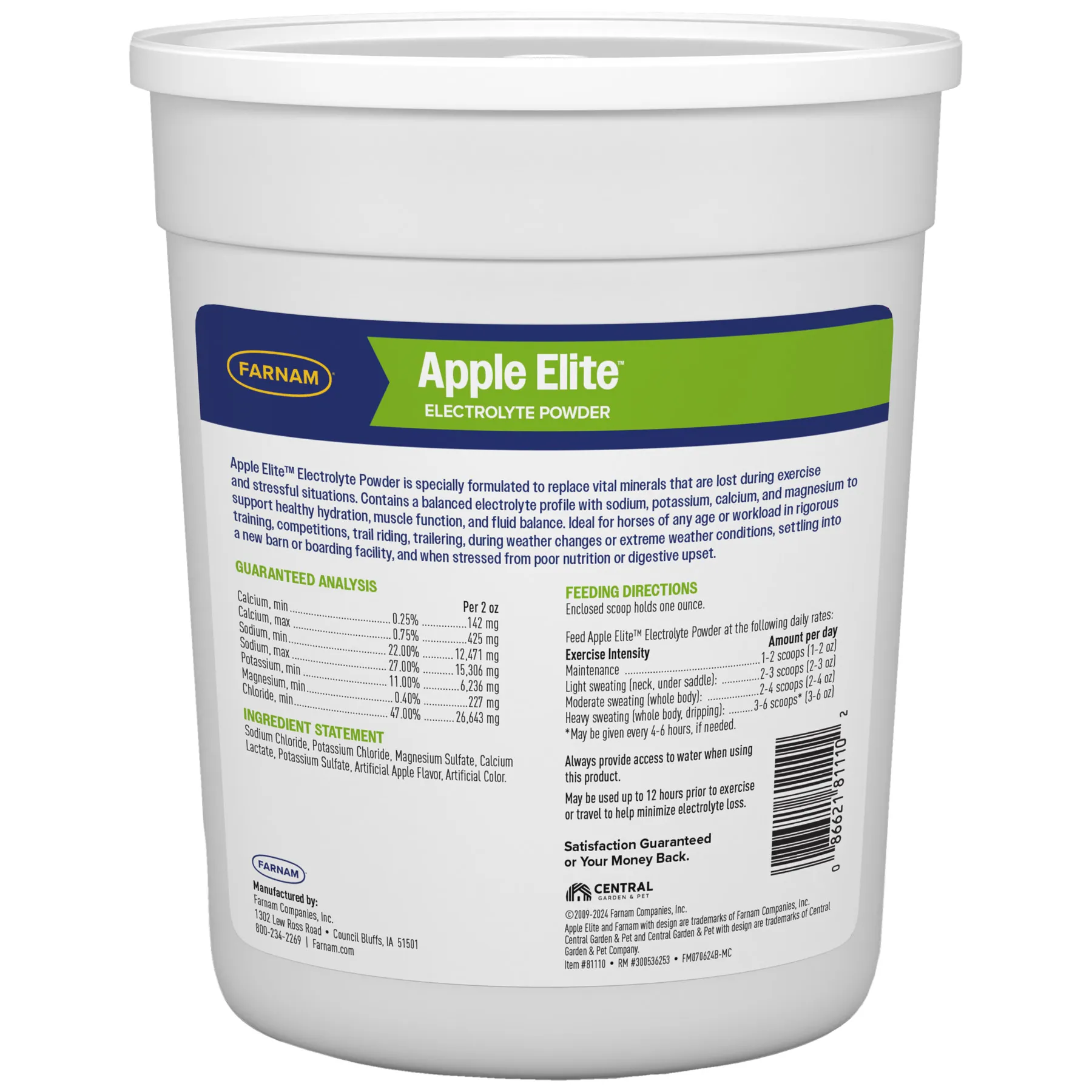 Help your horse bounce back faster from heat, exercise, and stress with this easy-to-use electrolyte supplement. Farnam Apple Elite™ Electrolyte delivers essential minerals lost through sweat in a palatable, granulated formula that mixes effortlessly into feed or water. With a sweet apple flavor horses love, it's perfect for supporting hydration and performance during tough rides or hot weather.