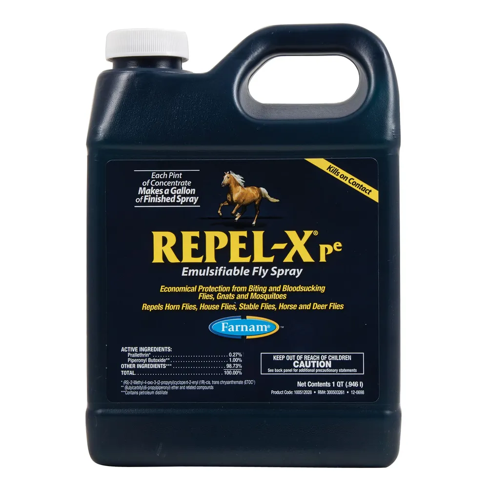 The Farnam® Repel-X® pe Emulsifiable Concentrate is for budget-friendly fly protection. The concentrated formula has been the horseman's choice for over 30 years. Simply mix the concentrate with water for ready-to-use fly spray. Repel-X pe provides economical protection from annoying, disease-carrying pests and insects, killing and repelling flies, gnats, mosquitos, and ticks.