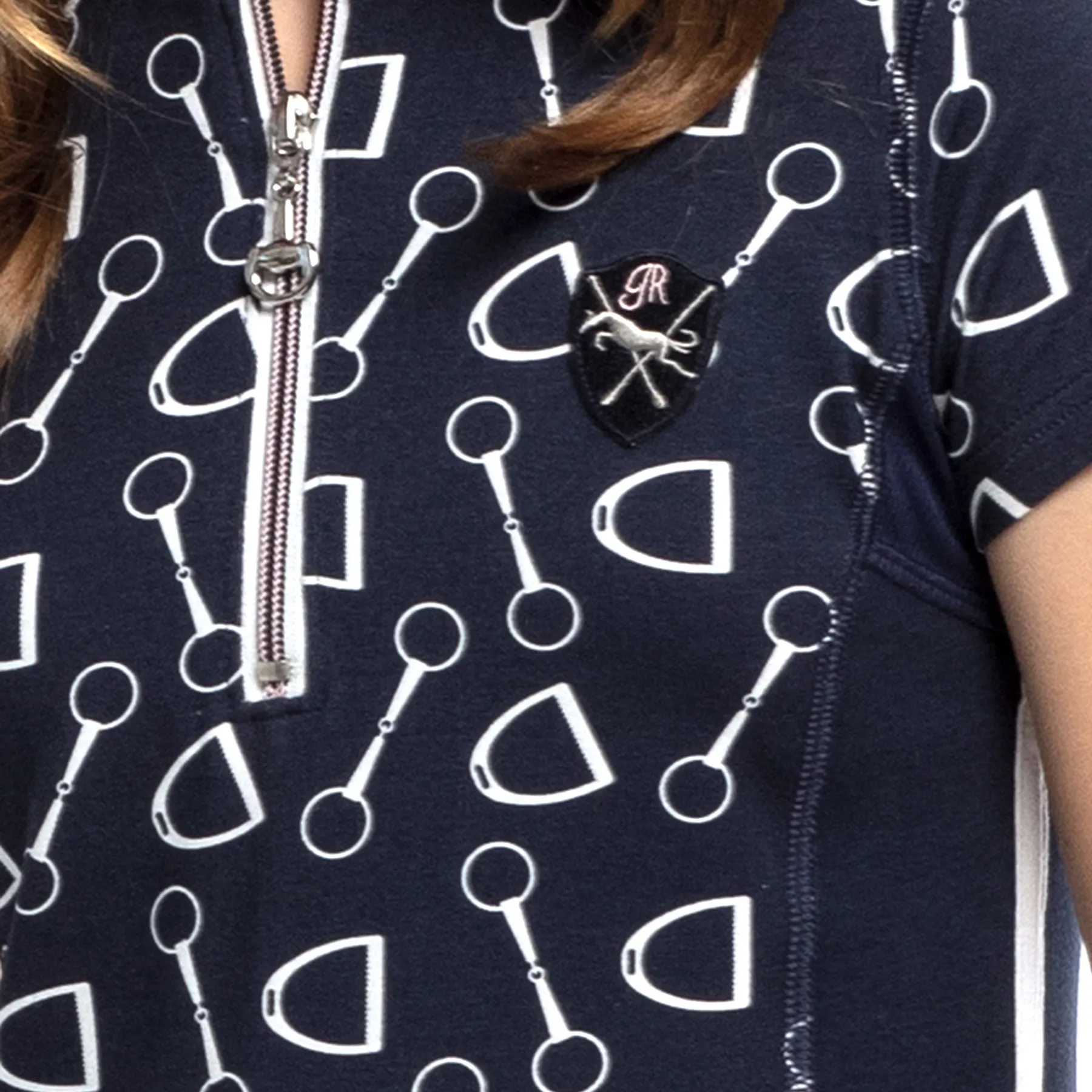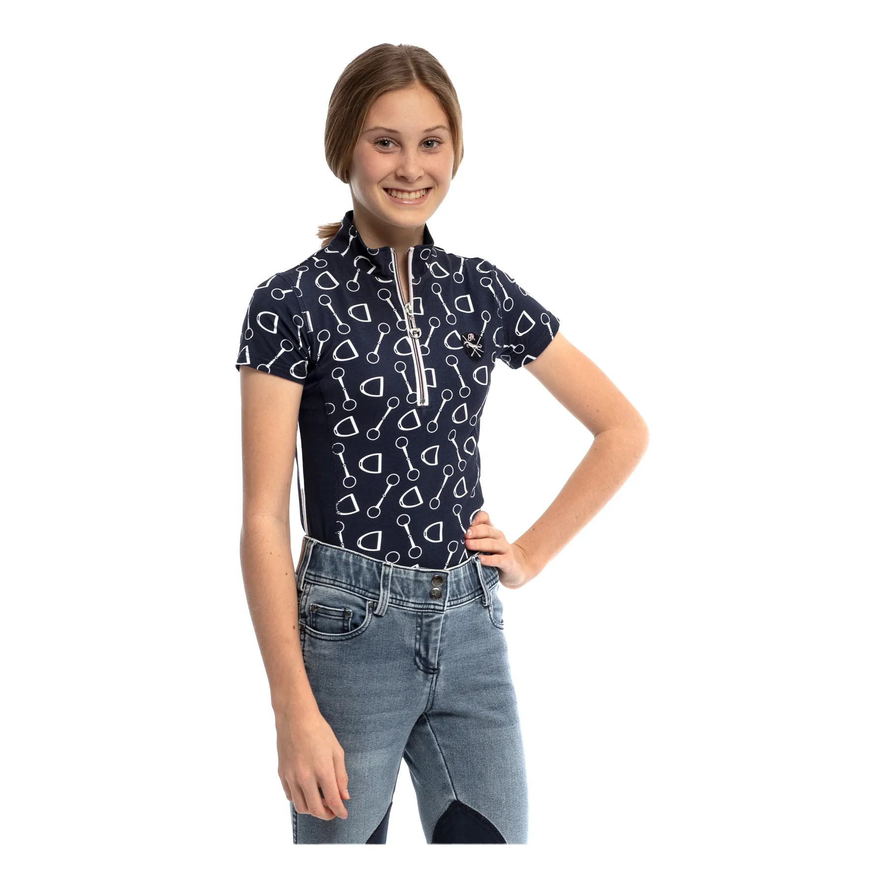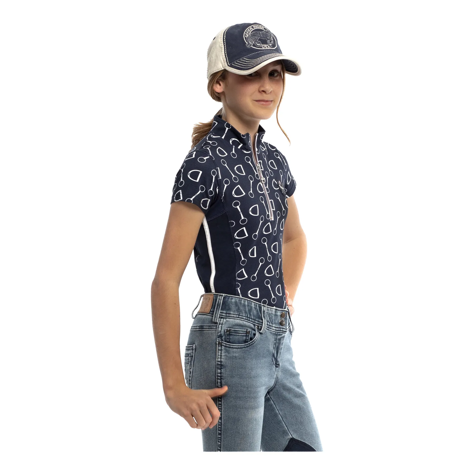 Great for year-round wear, this short-sleeved show shirt for girls is the perfect shirt for your young rider's wardrobe! Made of moisture-wicking fabric, this shirt has flattering princess seaming with contrast banding and cover stitch for a streamlined silhouette. The mock neck zip front has a silver horse-bit pull for added style.