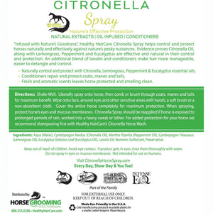 The Healthy HairCare Citronella Horse Spray is an all-natural fly repellent infused with nature's goodness to control and protect your horse against pesky nuisances effectively. Its unique blend of Citronella Oil, Lemongrass, Peppermint, and Eucalyptus essential oils is proven effective in deterring insects while conditioning your horse’s coat and protecting them from sun damage. The formula also contains lanolin and other conditioners to help manage, add volume, and detangle your horse’s hair. This multi-purpose spray even eliminates and prevents the growth of fungus on wounds, boosts the healing of wounds, relieves spasms and gas, stimulates and improves circulation, facilitates the healing of eczema and dermatitis, and reduces pain associated with swelling or tenderness. Plus, the fresh, aromatic scent will leave your horse smelling nice and clean!