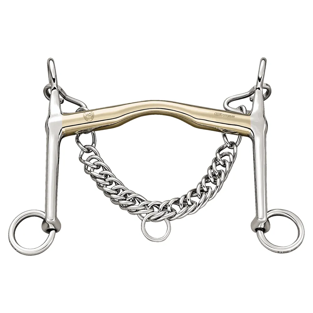 The Herm Sprenger® HO-Weymouth Sensogan Bit is the perfect starting point for horses and riders new to the double bridle. Designed with a forward-slanted, rounded port and slightly curved mouthpiece, it ensures gentle, even tongue pressure and encourages relaxed, responsive contact. Paired with 7 cm cheeks, it delivers a refined leverage effect that enhances communication without overwhelming sensitivity. Made from Sprenger's advanced Sensogan alloy, it's ideal for easing into more precise riding.