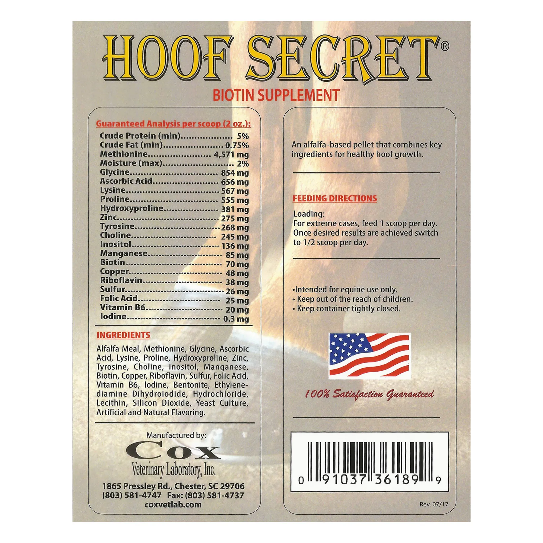 Hoof Secret is a nutrient-packed alfalfa-based pellet designed to support optimal hoof growth and overall hoof health. Combining Biotin, Zinc, Methionine, and B-Vitamins, this formula improves hoof hardness, thickness, and promotes a healthy coat. Ideal for addressing tender feet and promoting new growth, Hoof Secret is an essential addition to your horse's nutrition plan.