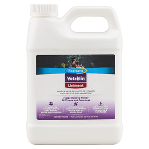 Vetrolin® Liniment is a delightfully aromatic camphor and soap analgesic concentrate to be used as a counter-irritant aid in the temporary relief of minor stiff and sore muscles caused by overexertion. Vetrolin® Liniment has a hint of green soap. It helps relieve inflammation, and stimulate blood flow to aching ankles, knees and tendons. It contains 5 essential oils to soothe...