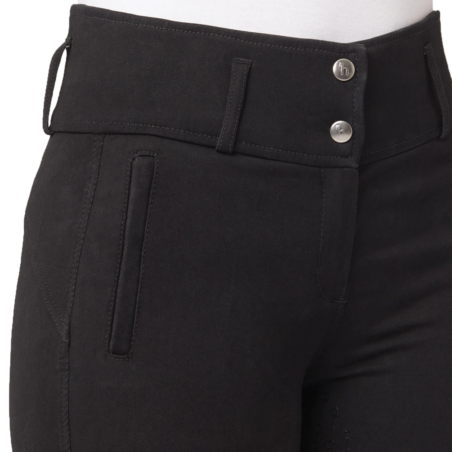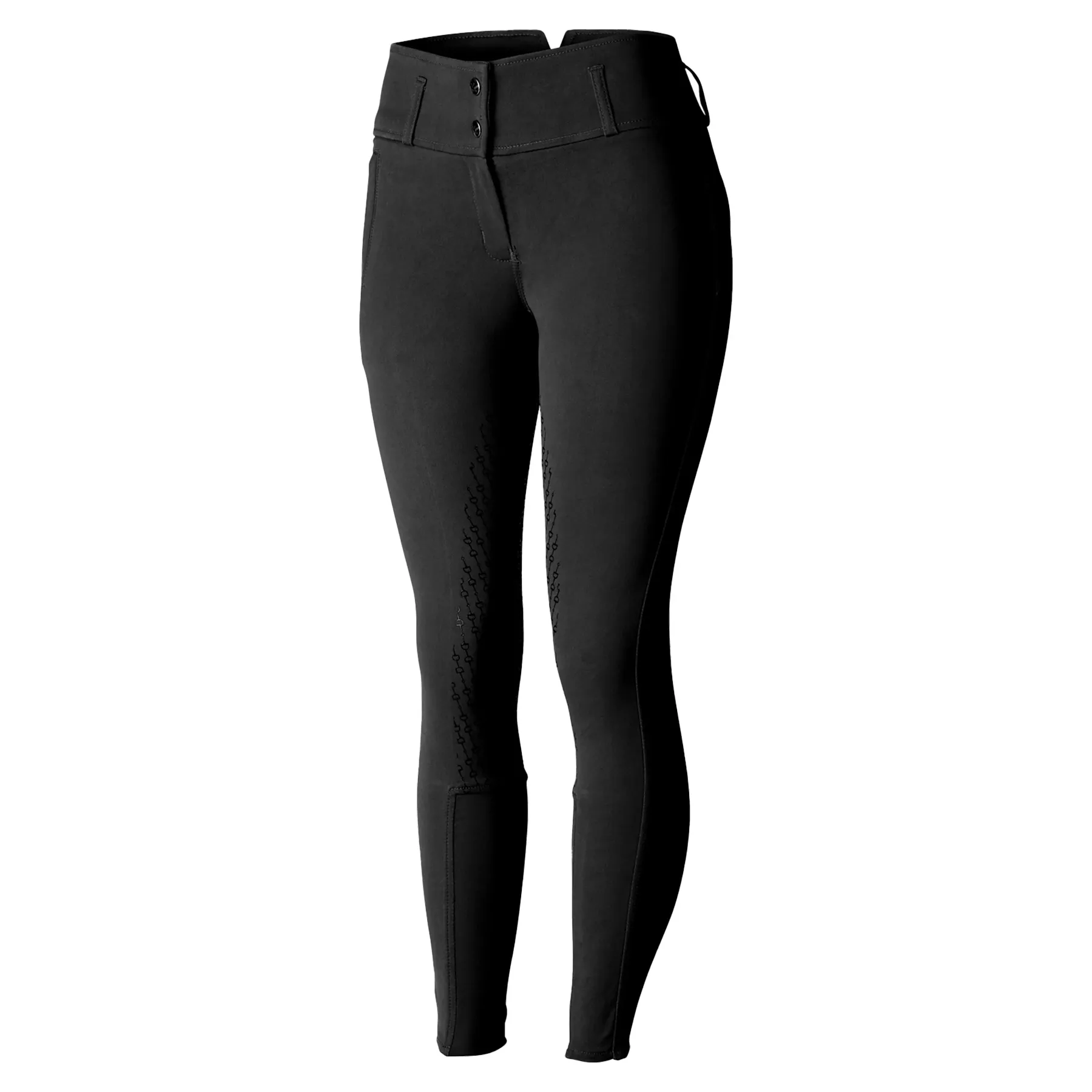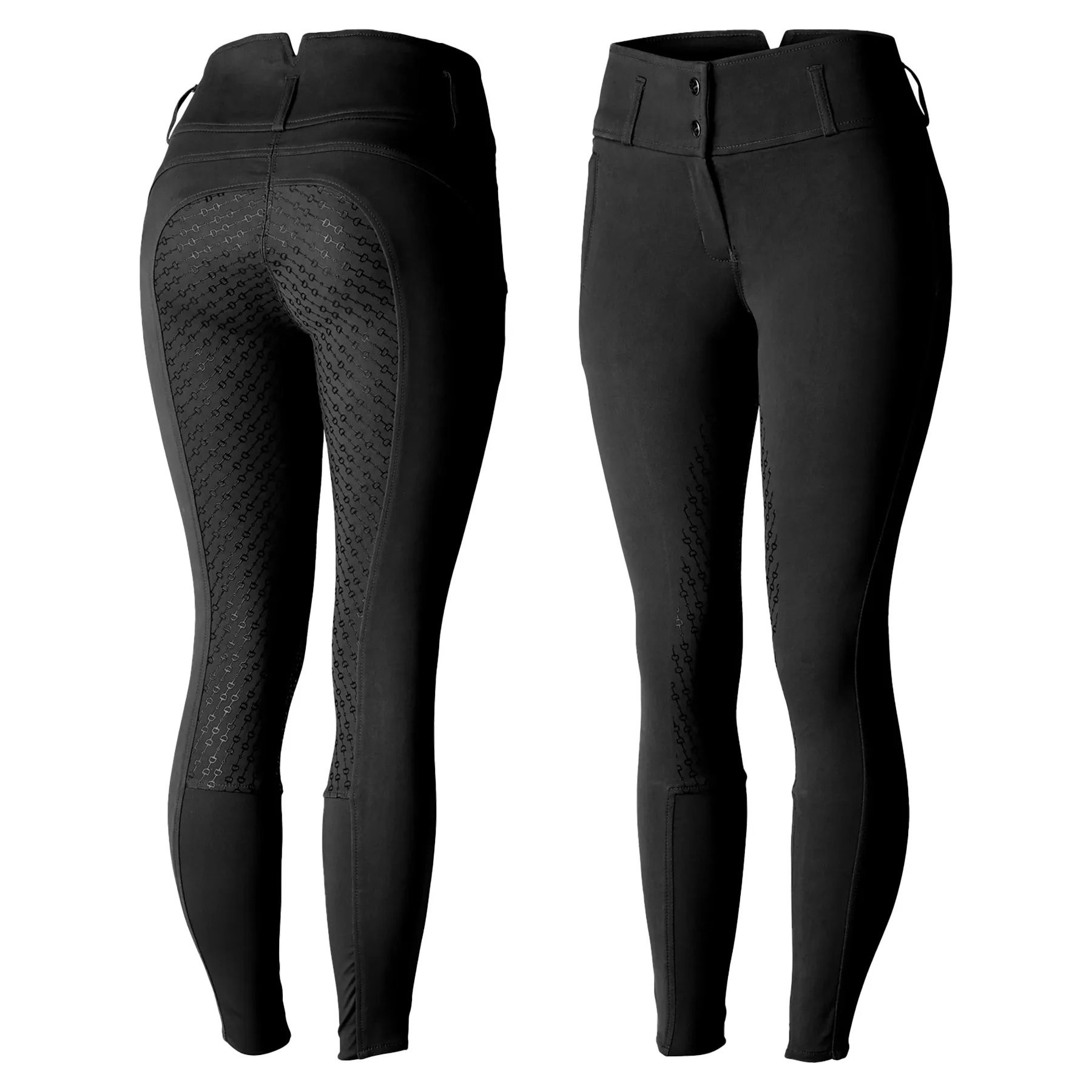 Blending classic style with modern flair, these breeches are your go-to for everything from weekend schooling to the show ring. The Horze Ladies Daniela Silicone Full Seat Breeches deliver a polished, flattering fit with a supportive high waist&mdashperfect for riders who appreciate both fashion and function. With their elegant bit-print seat and breathable cotton-blend fabric, these breeches keep you confidently comfortable ride after ride.