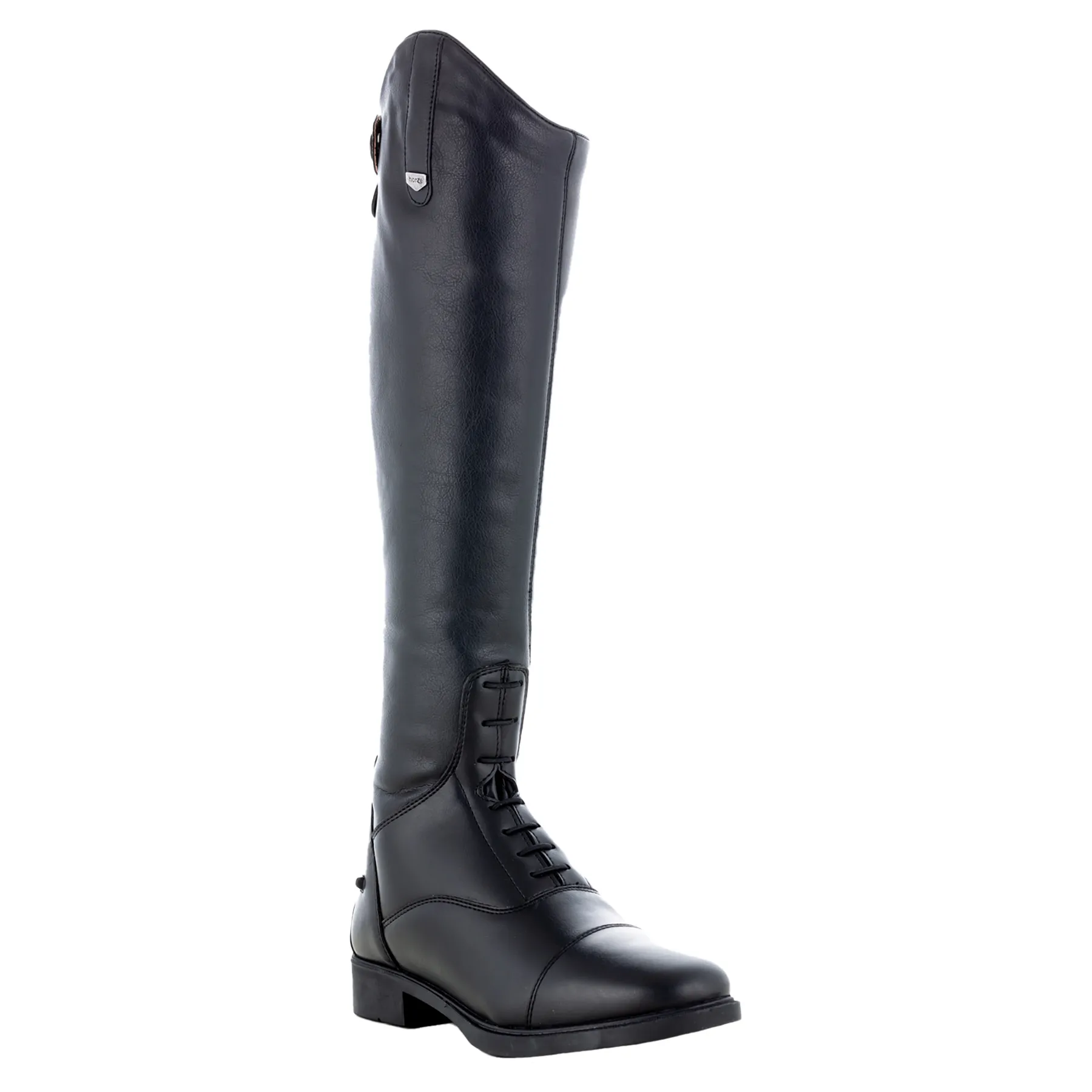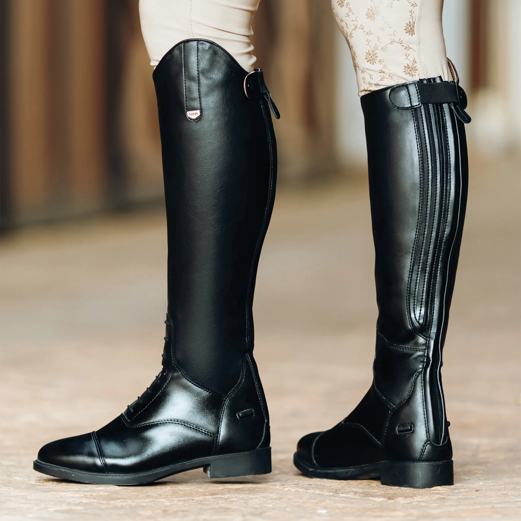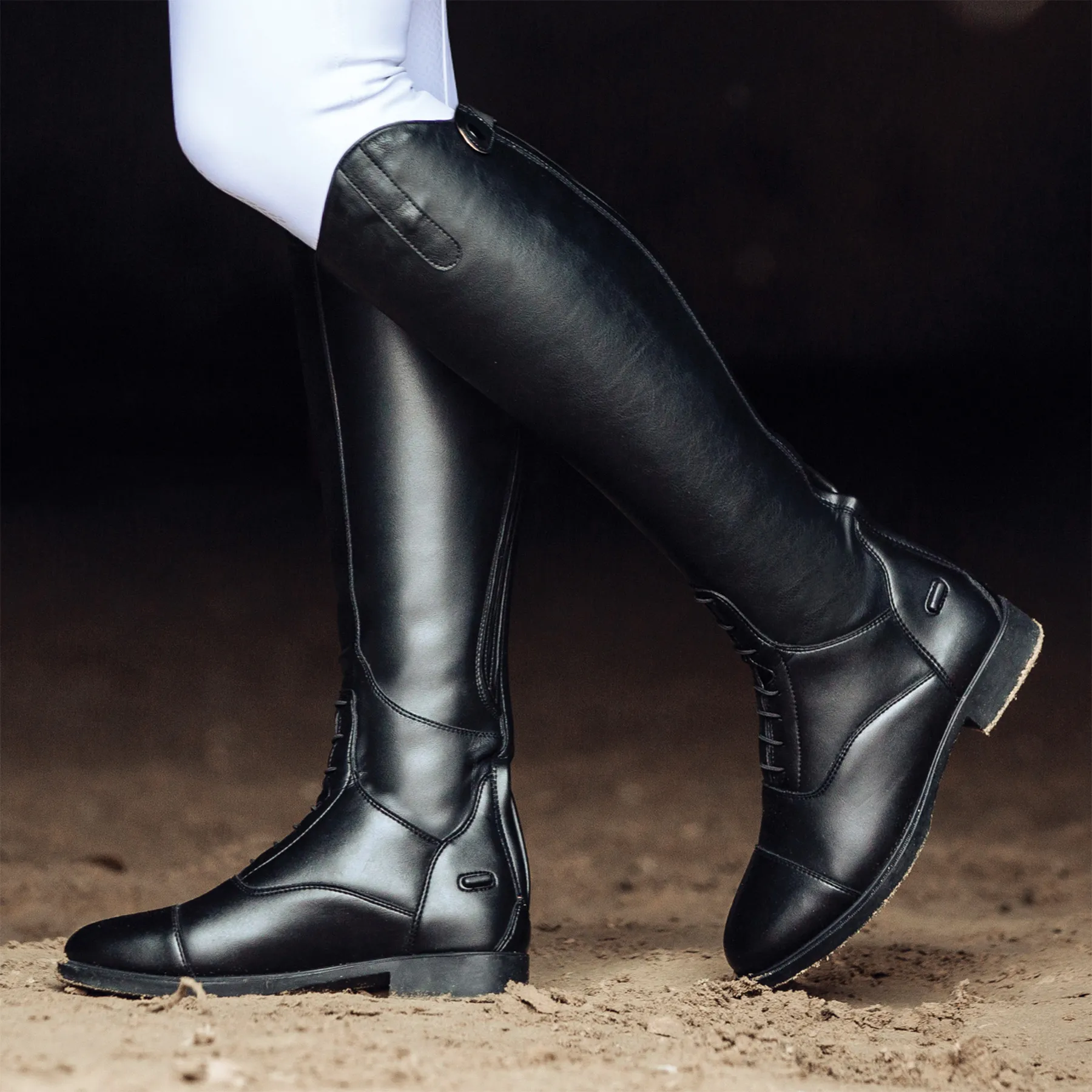 Step into timeless equestrian style with the Horze Ladies Rover Tall Field Boots. These affordable, elegant tall boots are crafted from soft synthetic leather that mirrors the look and feel of the real thing. A breathable mesh lining adds comfort, while elastic laces and calf panels ensure a flexible fit. The back YKK zipper with snap closure makes it easy to slip on and off. Whether you're riding or working around the barn, the comfort sole keeps you going in style.