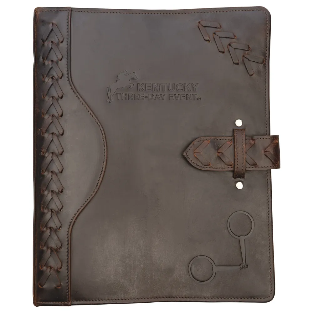 Keep your horse show paperwork, notes, and essentials neatly organized with the Limited Edition K3DE Leather Binder Padfolio. Crafted from rich dark oil leather, this elegant binder features laced-in braiding, a snaffle bit stamp, and a secure button snap closure. Designed for function and style, it includes a 1" four-ring binder, multiple storage slots, and space for an 8x10 notepad, making it the perfect show-day companion or a thoughtful gift for equestrians.
