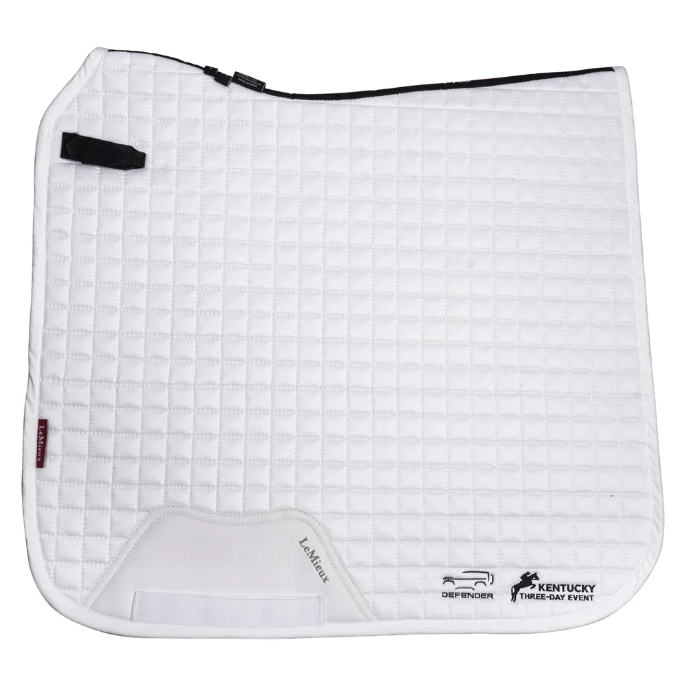 The K3DE Defender LeMieux® Prosport Suede Dressage Saddle Pad combines luxury, performance, and practicality for dressage riders. Designed to fit a wide range of saddles, it features high wither relief, elasticated D-ring tabs, and a reinforced girth protection area. The elegant suede top is paired with an ultra-soft bamboo lining that wicks moisture, controls odor, and minimizes friction for superior comfort. Finished with the official Defender Kentucky Three-Day Event logo, this pad is as stylish as it is functional.