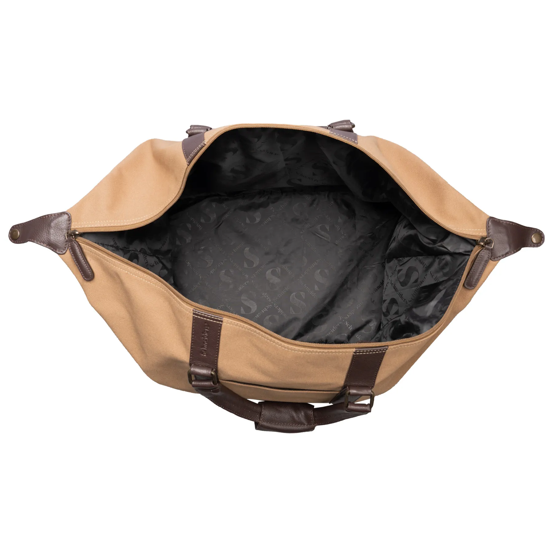 - Rolled leather handles with button snap closure for secure carrying