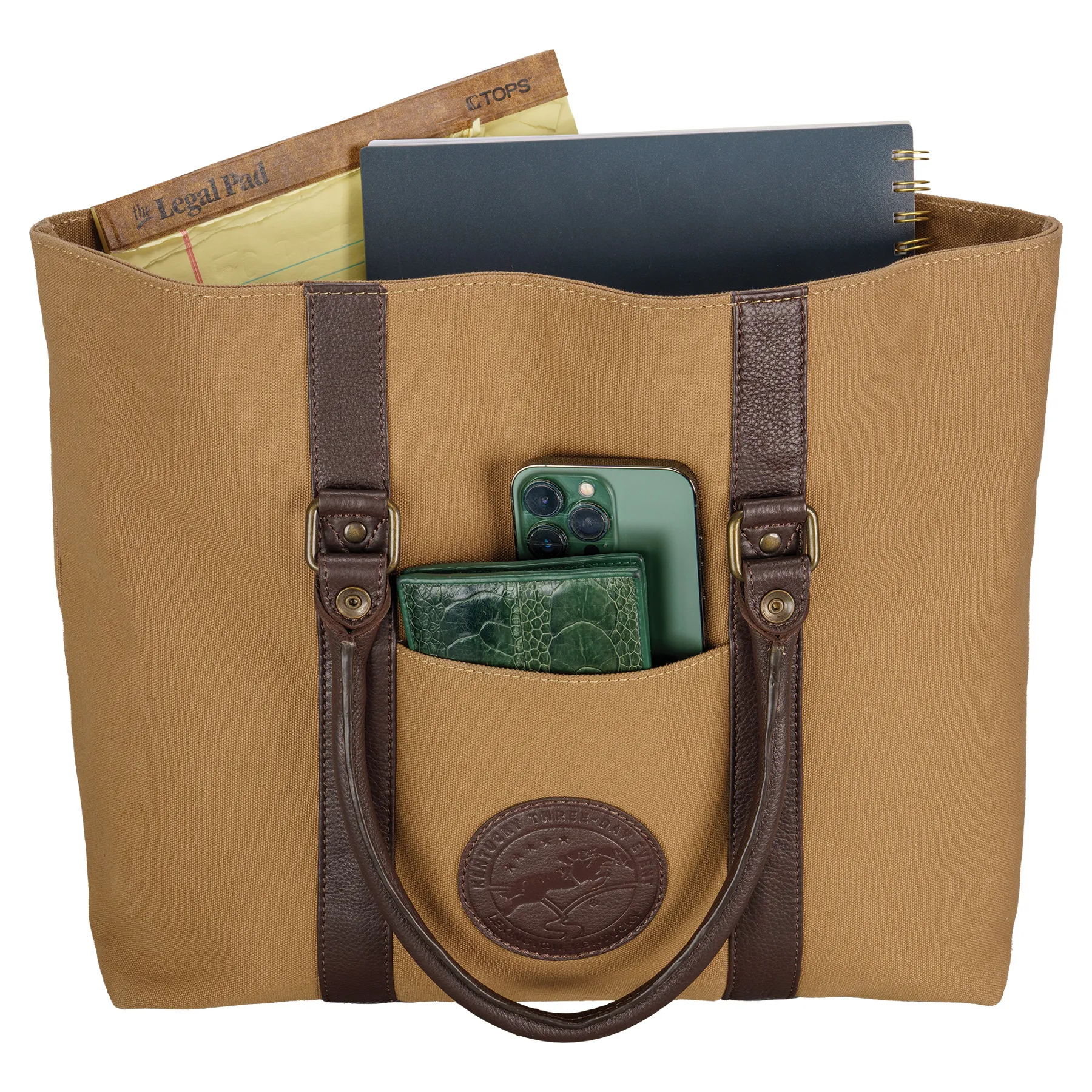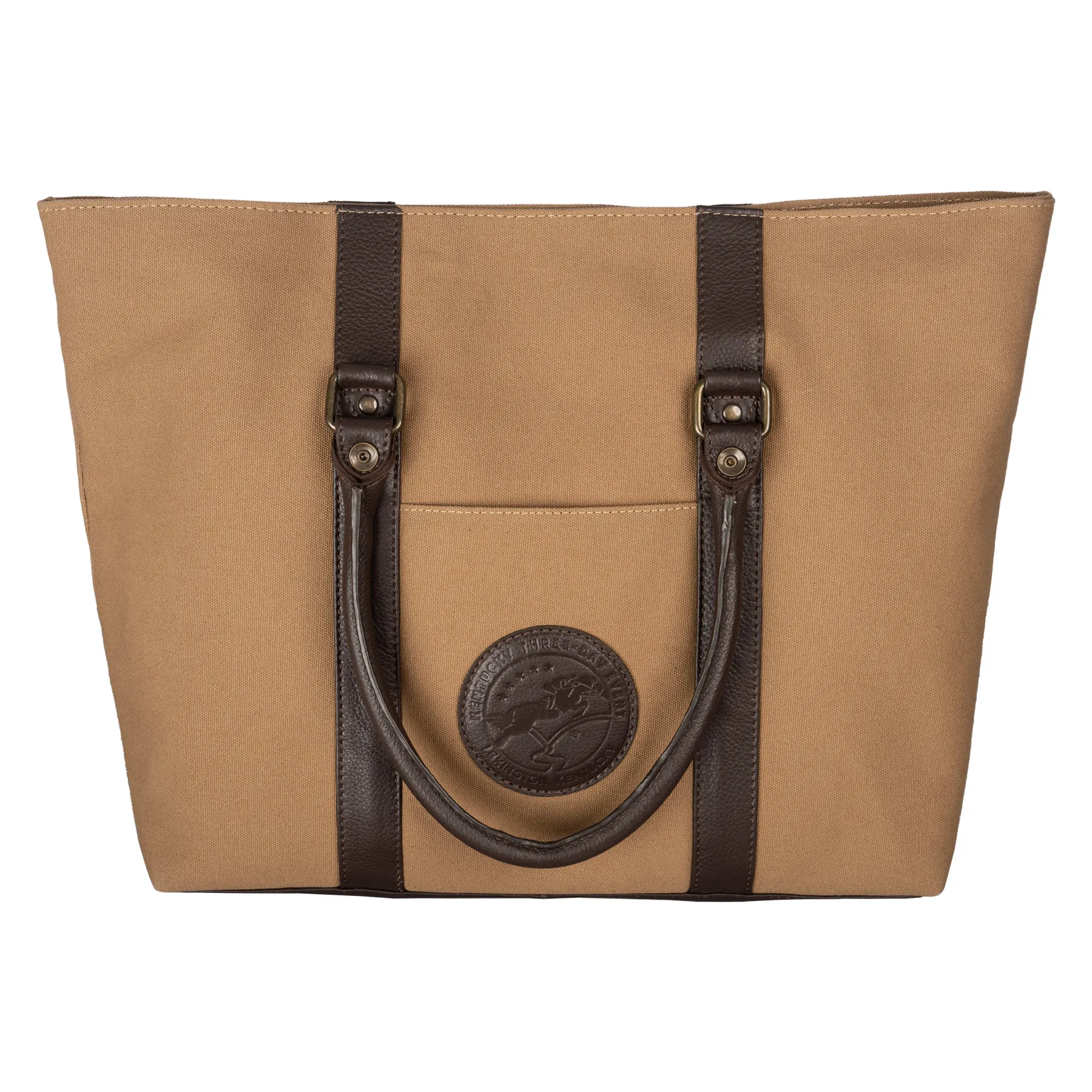 Classic style meets barn-ready durability with this Limited Edition Kentucky Three-Day Tote Bag! Perfect for a day at the barn, commuting, or everyday errands, this canvas and leather tote is both functional and effortlessly stylish. With reinforced handles, antiqued bronze hardware, and a spacious interior, it's designed to carry everything from laptops to barn essentials while keeping you organized in style.