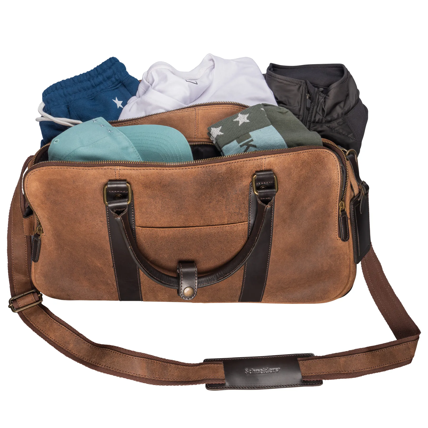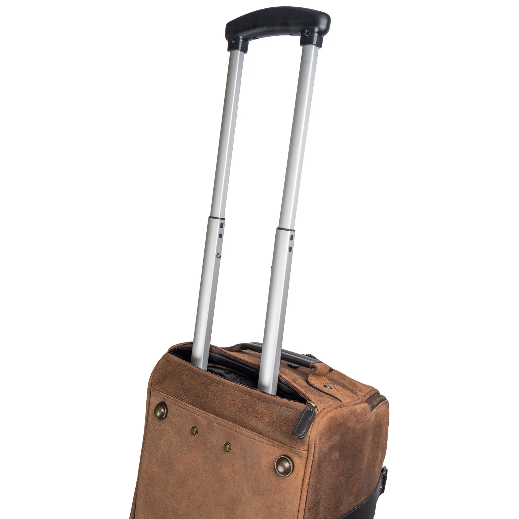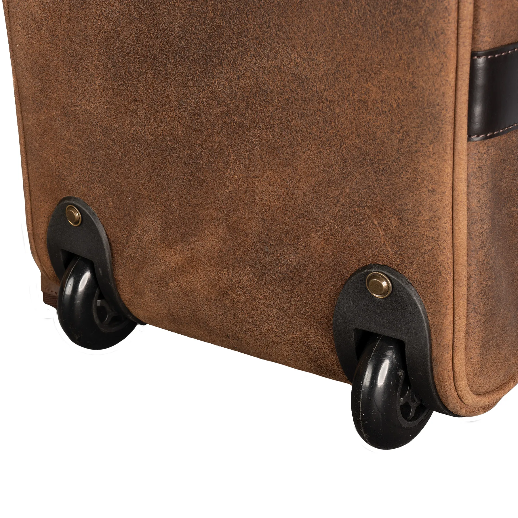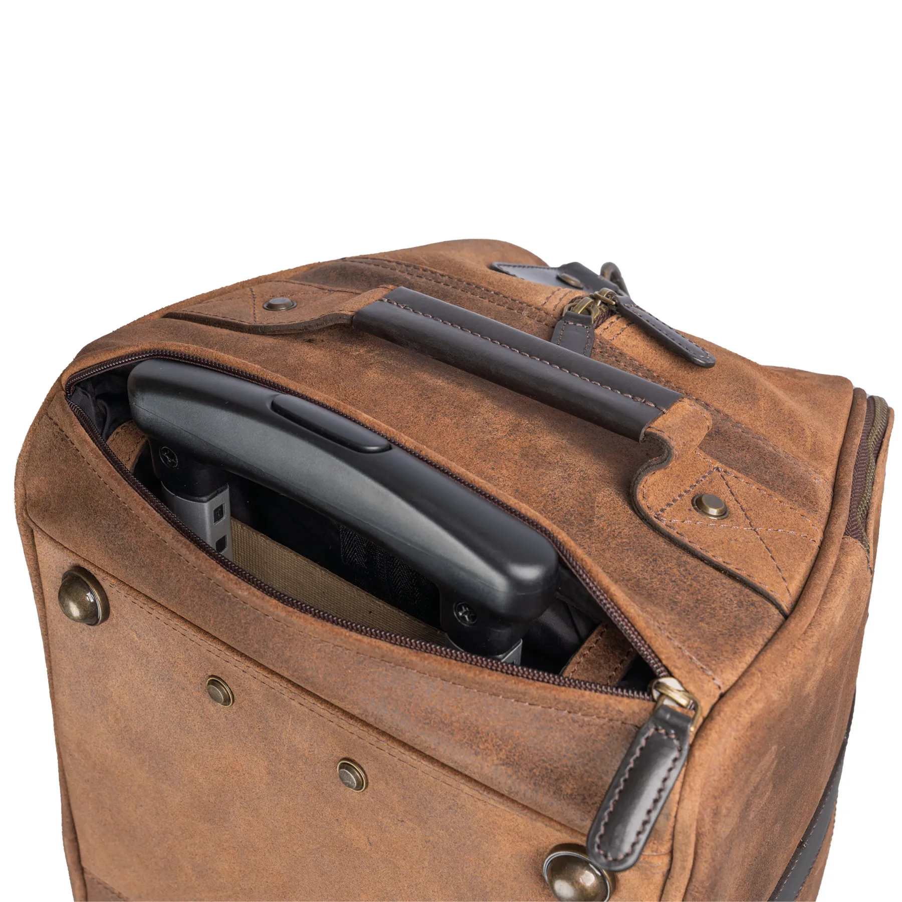 - Rolled leather carry handles with a slidable button closure