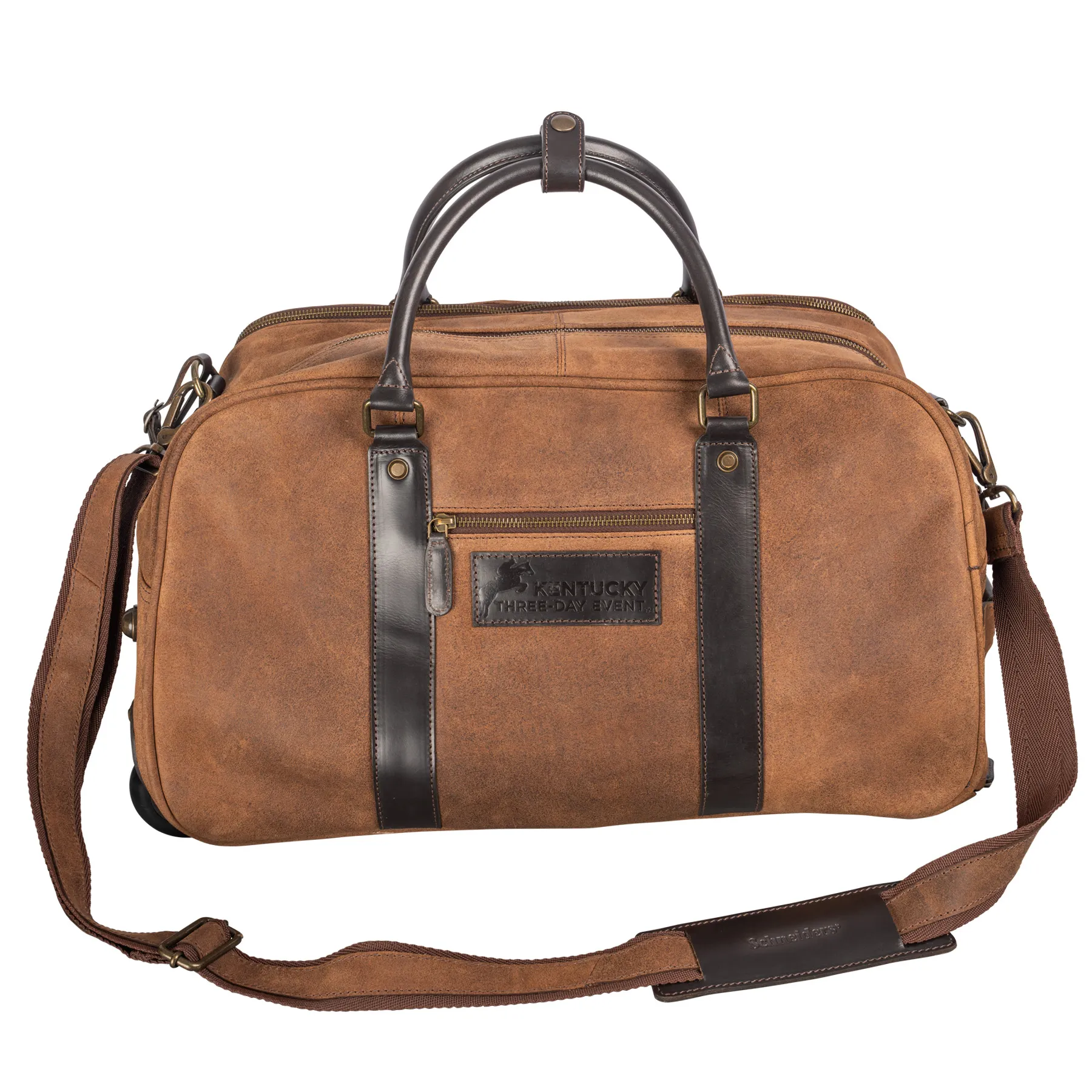 Travel in style and convenience with the K3DE Lexington Leather Rolling Duffle Bag, the ultimate weekender bag for equestrians on the go. Crafted from pre-oiled split hide leather with a rugged roughout feel, this durable and spacious duffle features multiple pockets, a stowaway retractable handle, and rolling wheels for effortless transport. Whether you're heading to a horse show, weekend getaway, or flight, this carry-on-friendly duffle keeps your gear organized and secure.