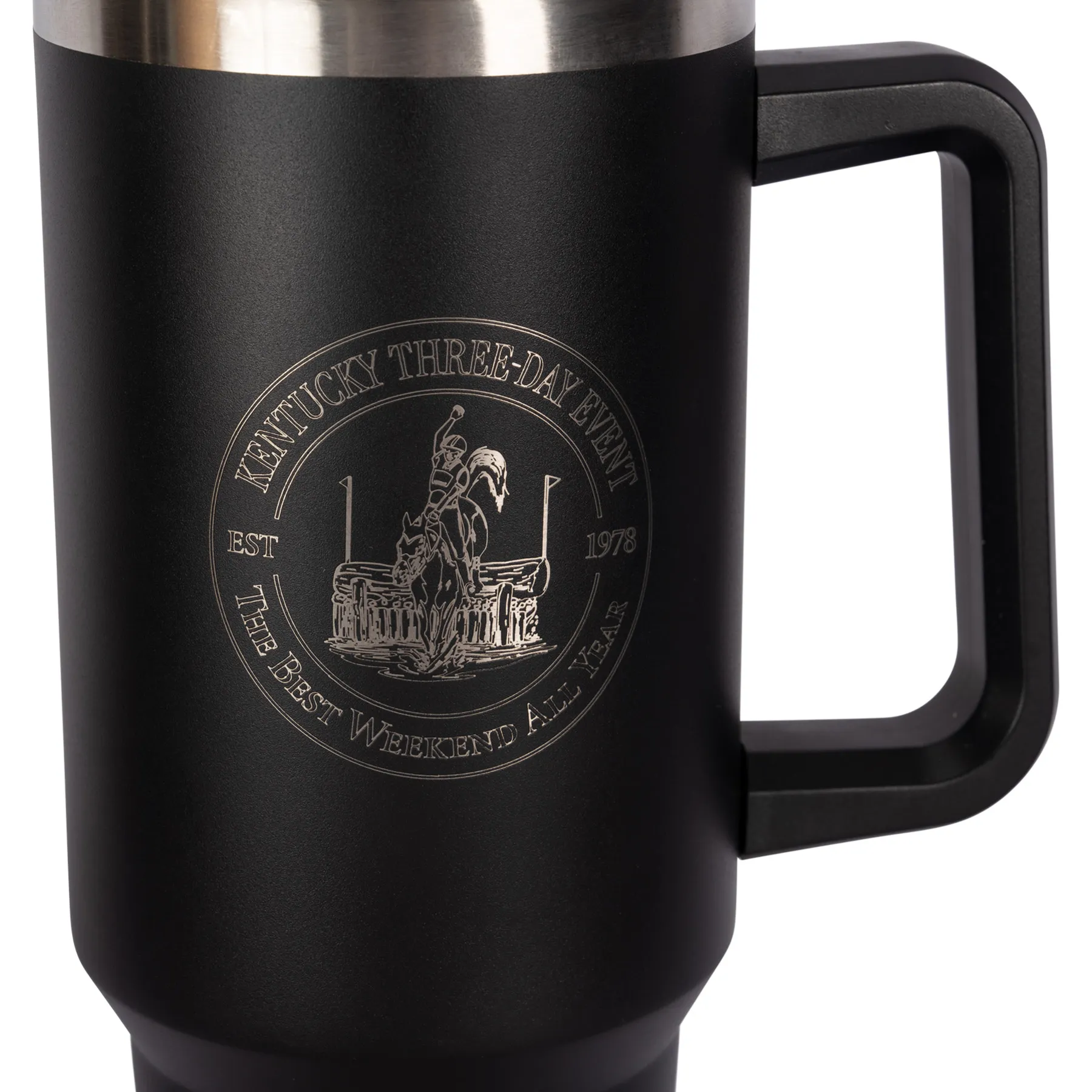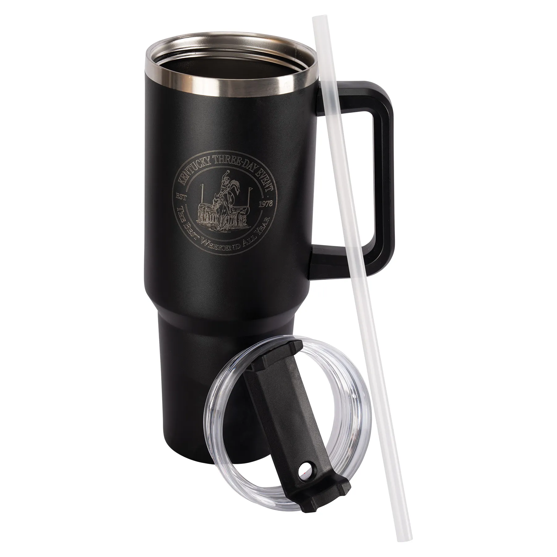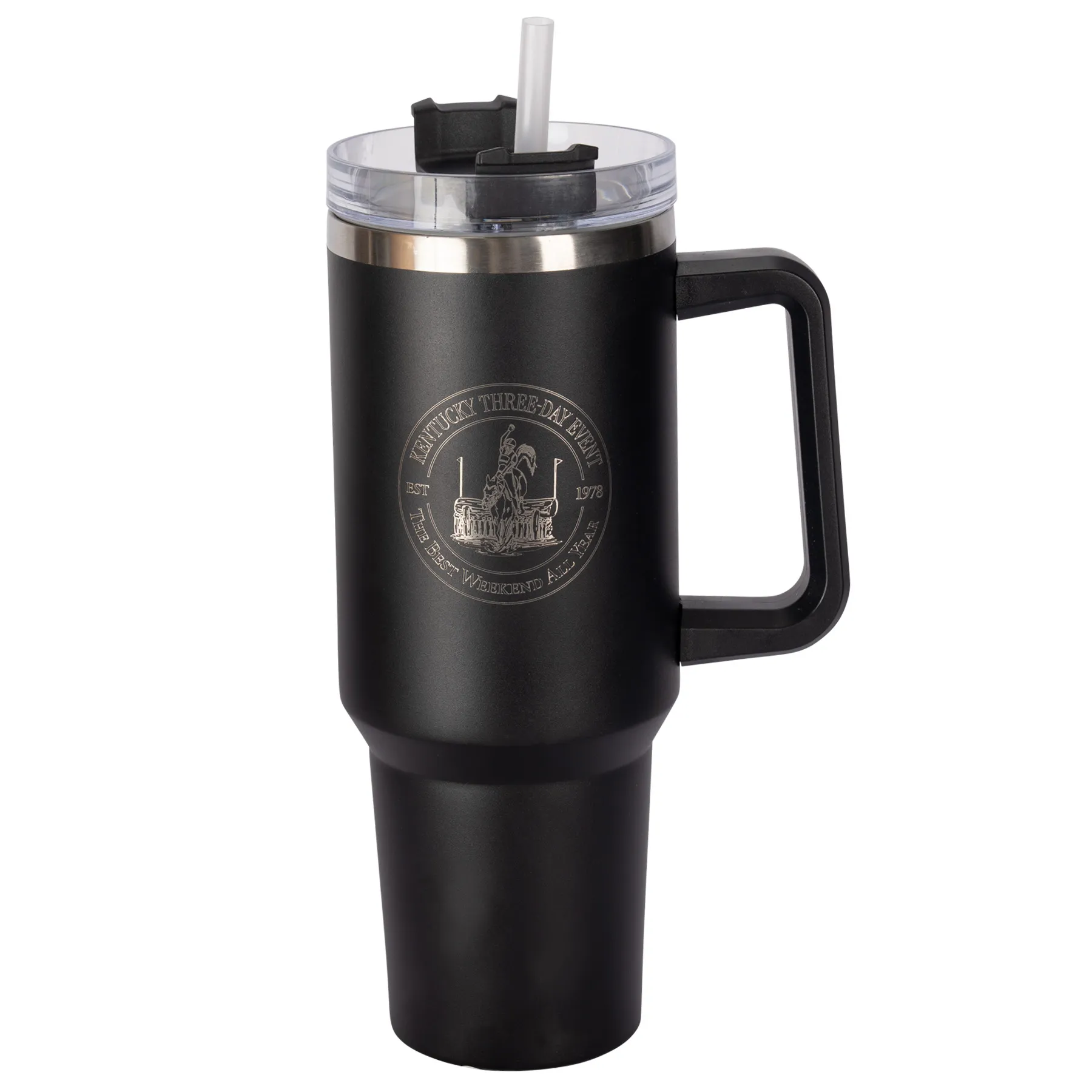 Stay hydrated with this Kentucky Three-Day 40 oz tumbler, designed to keep your favorite drinks at the perfect temperature, whether you're at the barn, on the road, or relaxing at home. Built tough with premium stainless steel and double-wall insulation, it keeps beverages ice-cold for hours or piping hot through your busiest days. The convenient handle and versatile straw lid make sipping easy no matter where you roam.