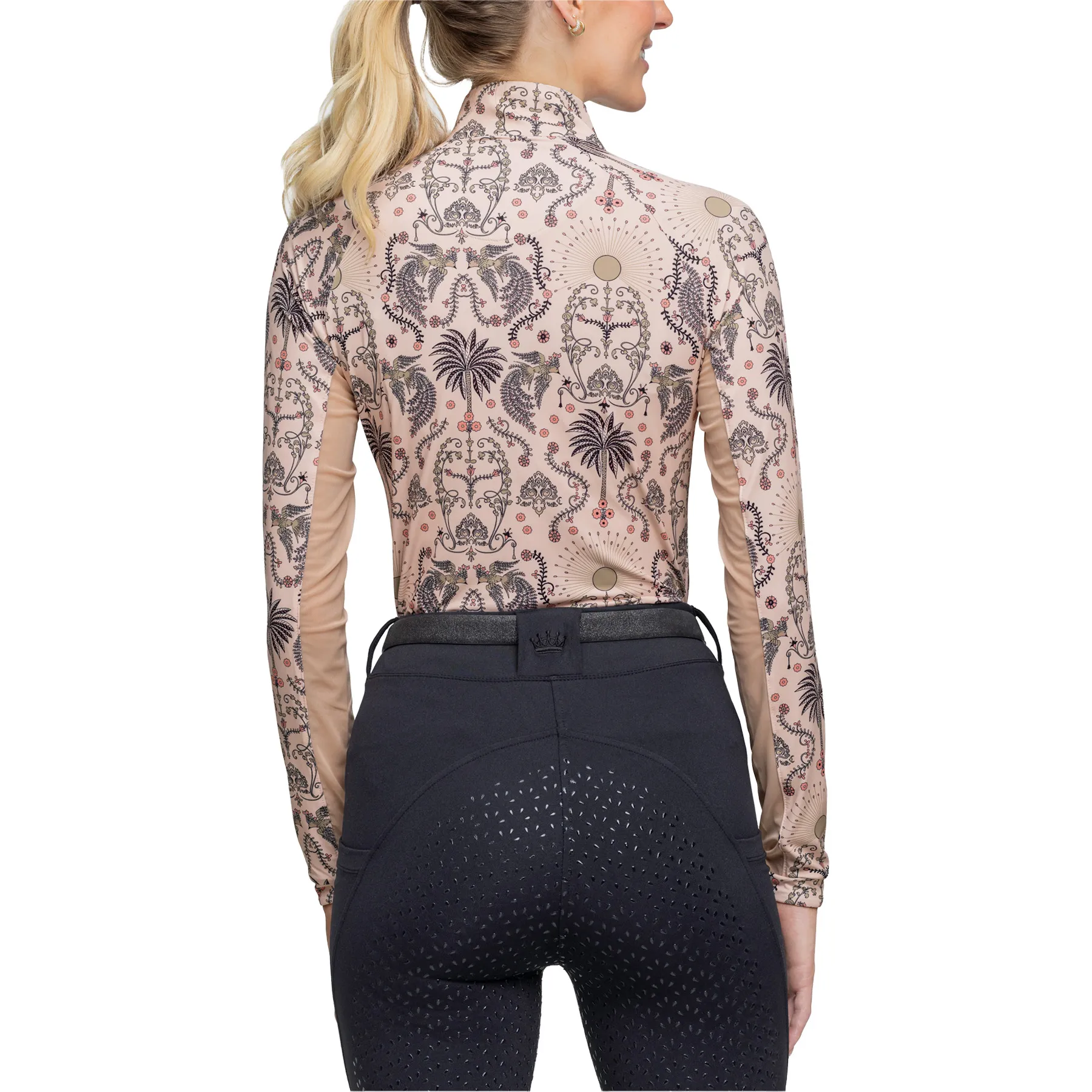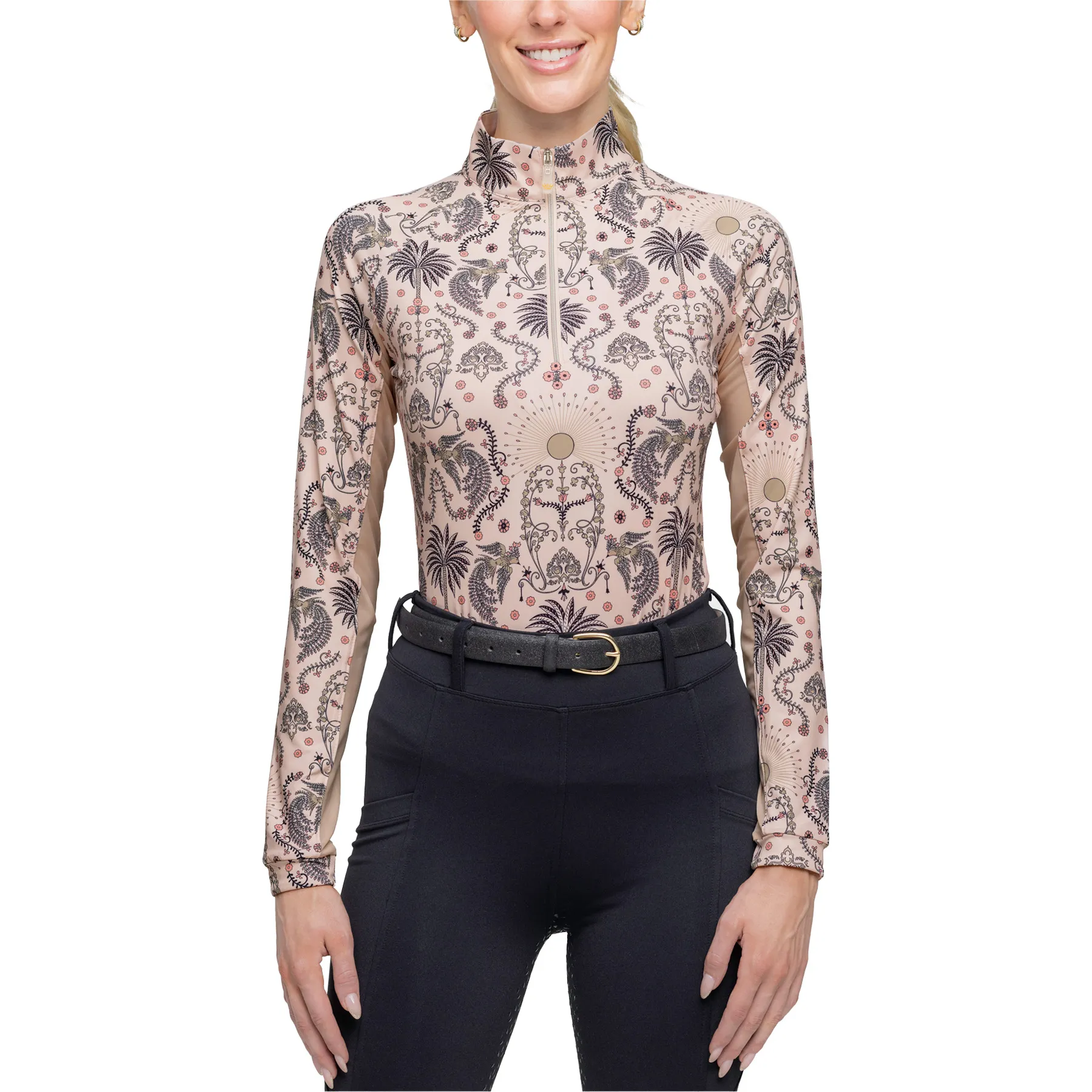 Stay stylish and protected in the Kastel Denmark Ladies Coral Regal Palm 1/4 Zip Long Sleeve Sun Shirt. Designed with a stunning Art Deco regal palm print in soft pink, coral, and desert sand tones, this contemporary-fit sun shirt combines elegance with performance. The lightweight, four-way stretch fabric ensures all-day comfort, while the breathable power mesh sleeves and UPF 30+ protection make it perfect for warm-weather rides.