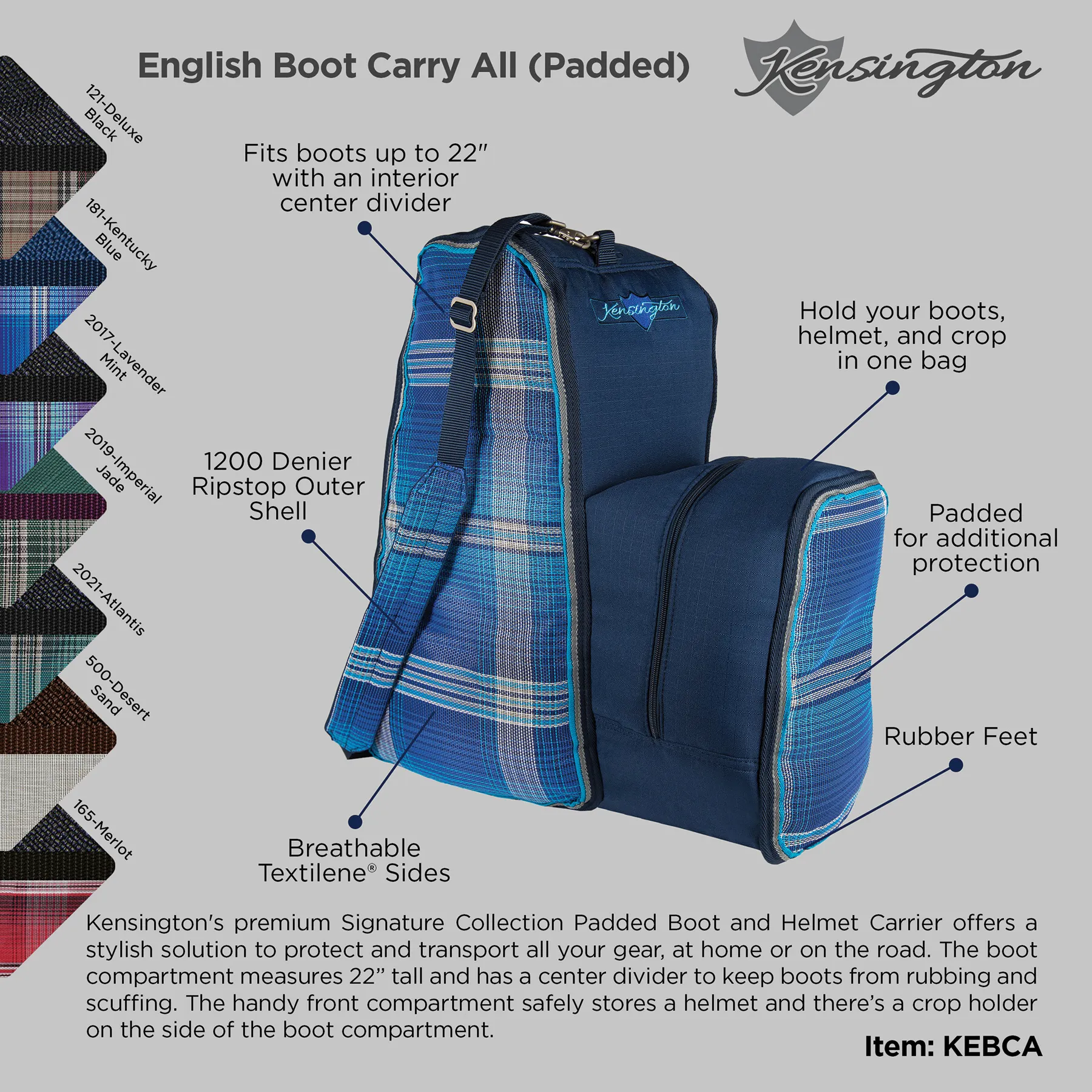 Tackle tack organization with ease using the Kensington English Boot and Helmet Carry All Bag. Designed to keep your boots, helmet, and crop all in one stylish and protective place, this multi-compartment gear bag is perfect for show days or everyday barn runs. With a center divider to prevent boot scuffing, a dedicated helmet compartment, and a handy crop holder, it keeps your essentials secure and easy to grab and go.