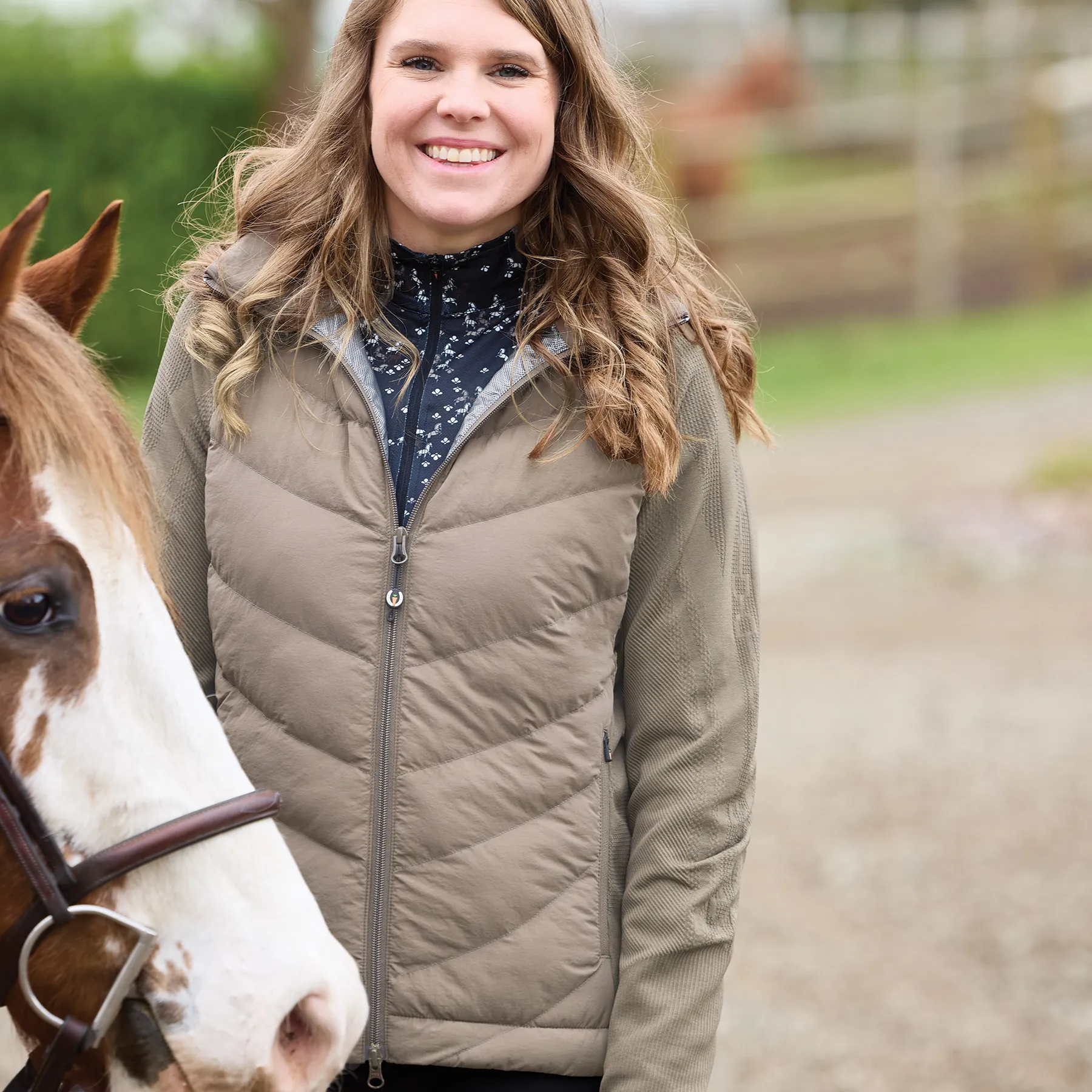 Designed for riders who brave chilly mornings and active days at the barn, this hybrid jacket keeps you warm without holding you back. The quilted, poly-loft insulated core retains heat with the help of a thermal-reflective lining, while four-way stretch sleeves and side panels offer unrestricted mobility. With a removable insulated hood, ergonomic seams, and fleece-lined pockets, it's a versatile layer built for the barn, the trail, or the town.