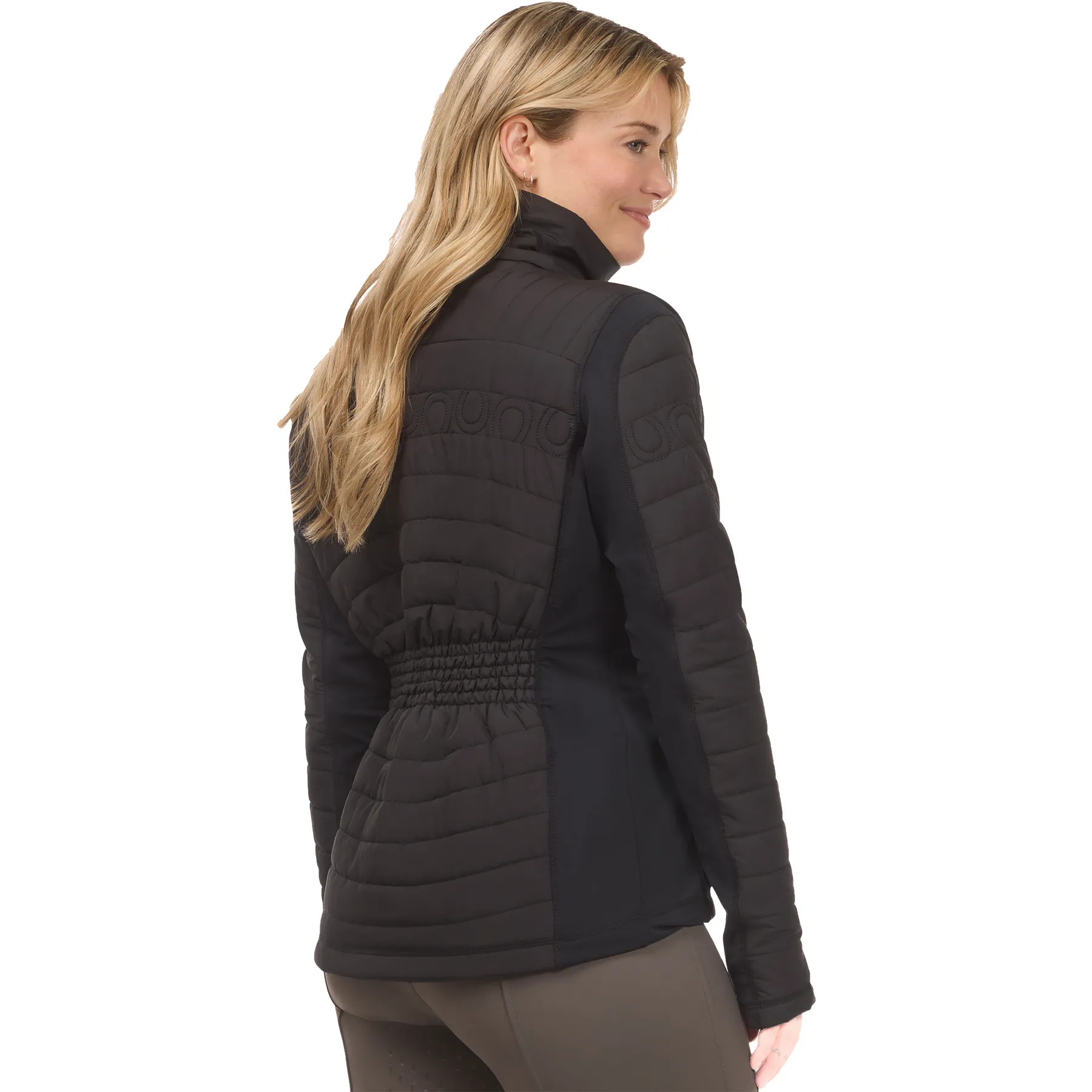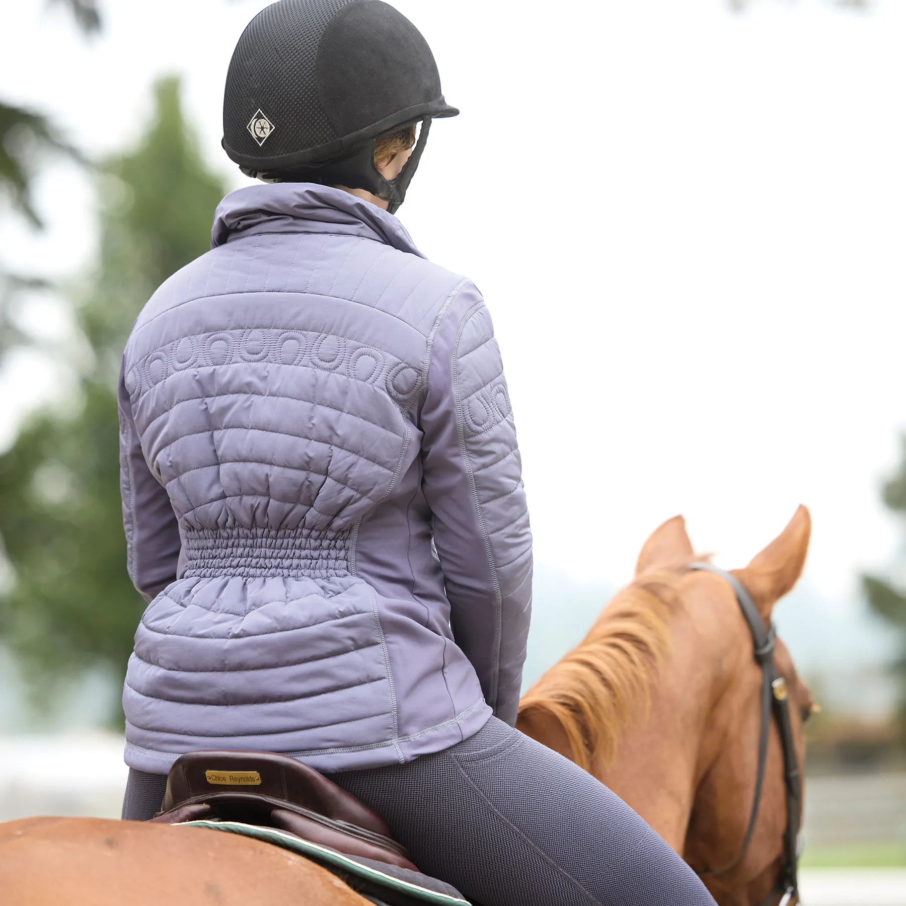 From chilly rides to errands in town, this quilted pullover delivers warmth, mobility, and equestrian charm all in one. Lightweight poly-loft insulation keeps your core cozy, while stretch side panels offer freedom to move. Thoughtful features like a fleece-lined collar, extended half zip, and a cinched waist create both function and flattering style. Subtle embroidered horseshoe details add a touch of texture that makes this piece barn-ready and beyond.
