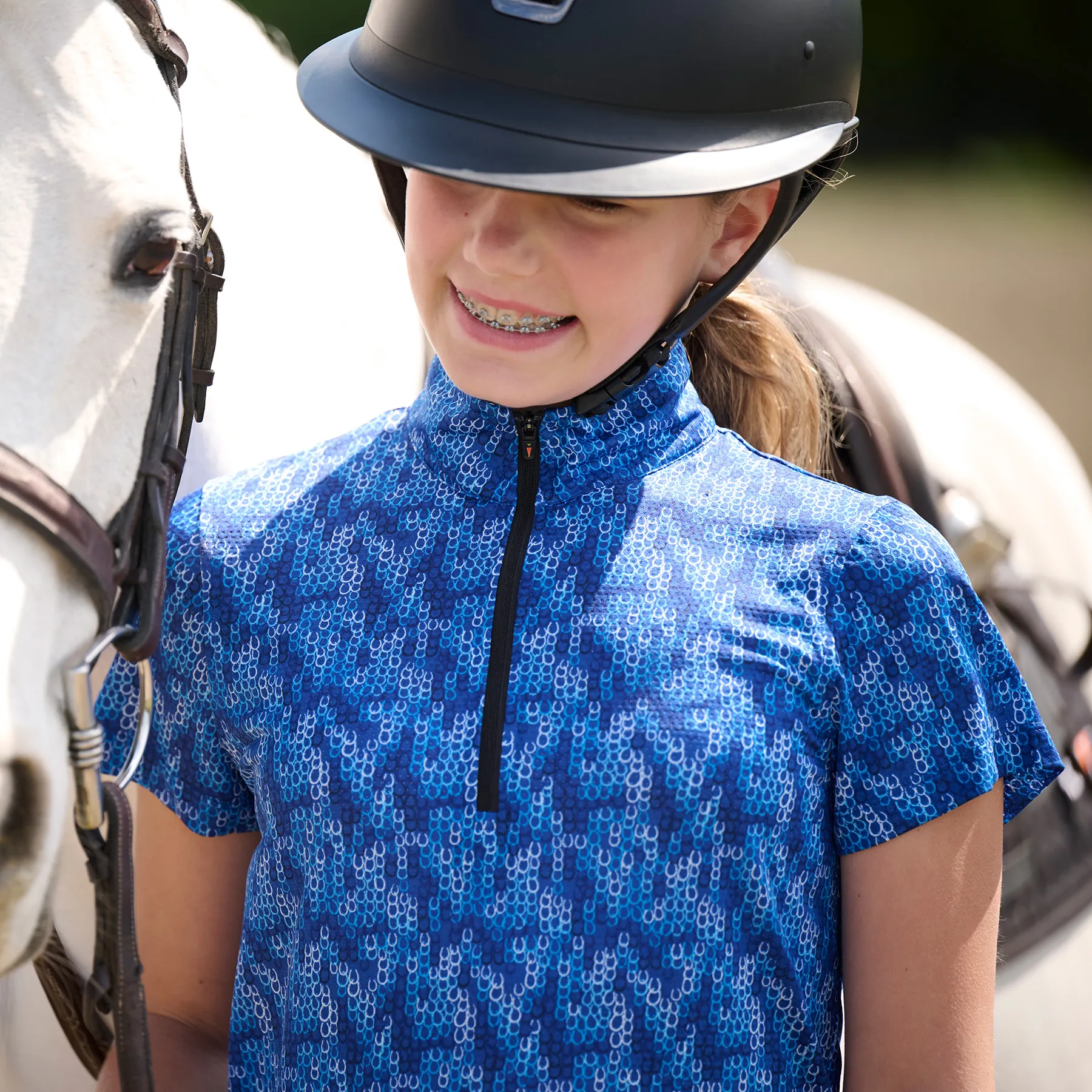 A summer staple for pony-loving kids, this ultra-lightweight Kerrits® Kids EquiBreeze Ice Fil® Printed Short Sleeve Shirt keeps young riders cool, comfortable, and sun-safe. Designed with fun, equestrian-themed prints that cleverly disguise dirt and slobber, it's the perfect blend of playful style and practical performance. With featherlight Ice Fil® Lite fabric that cools as they ride, this shirt is made to keep up with active barn days.