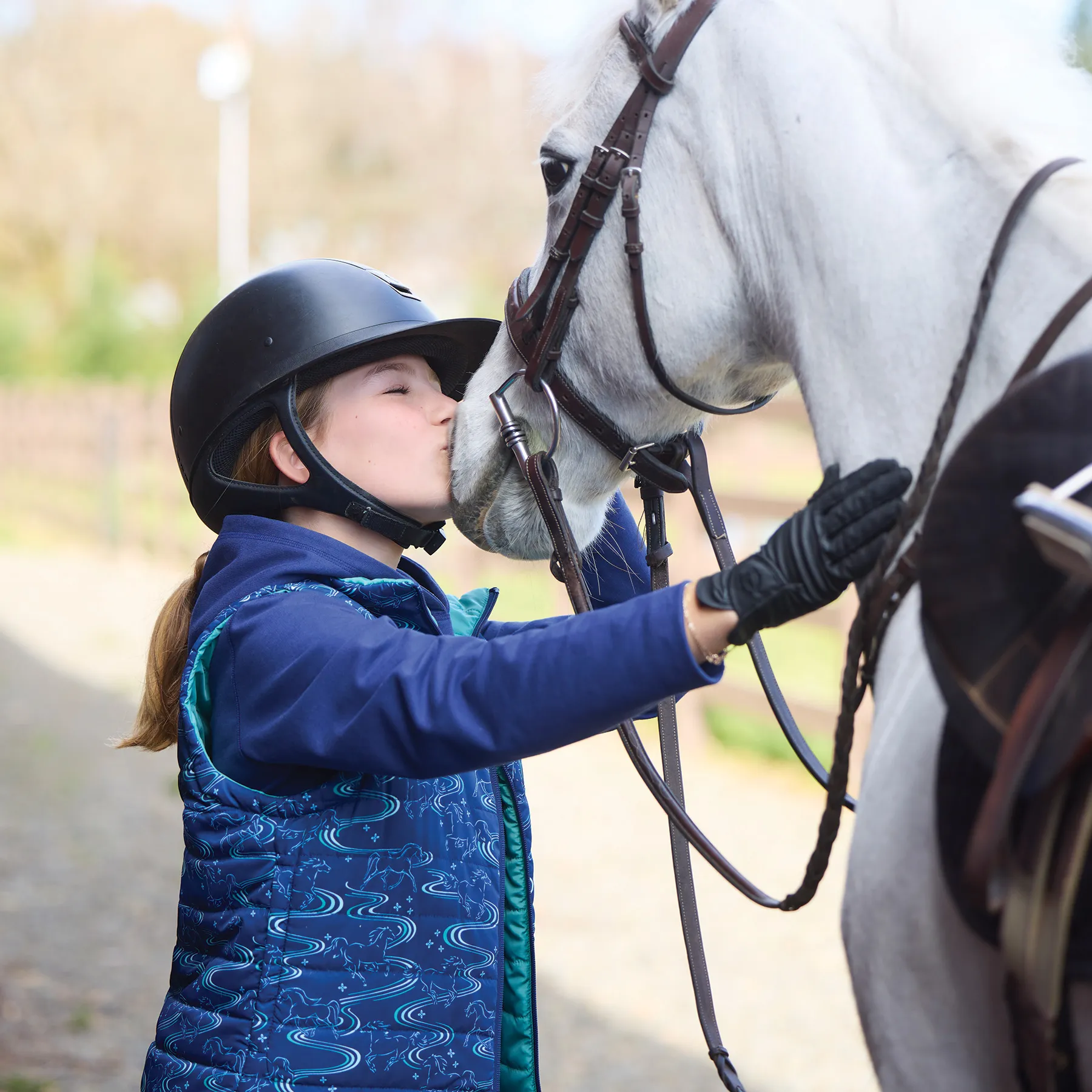 Pony-filled days call for playful layers, and this reversible quilted vest delivers two charming looks in one cozy package. Lightly insulated with 100g poly-loft fill, it's just right for crisp mornings, trail rides, and barn adventures. One side features Kerrits' exclusive "Ride the Wind" print, while the other adds a pop of color with cheerful horseshoe graphics. A tall collar, longer back hem, and functional pockets make this a comfy favorite for every young equestrian.