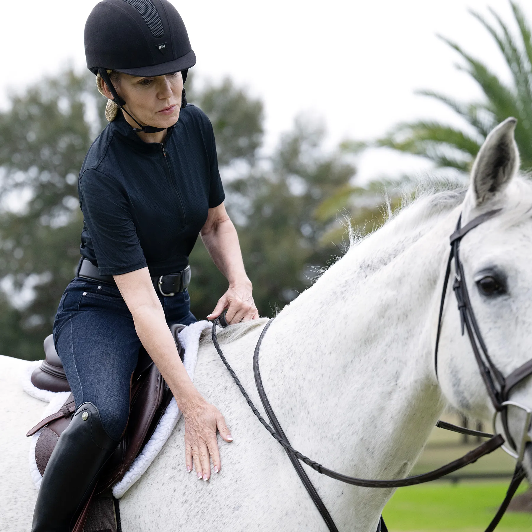 - Stock tie loop, high collar, and equestrian hem