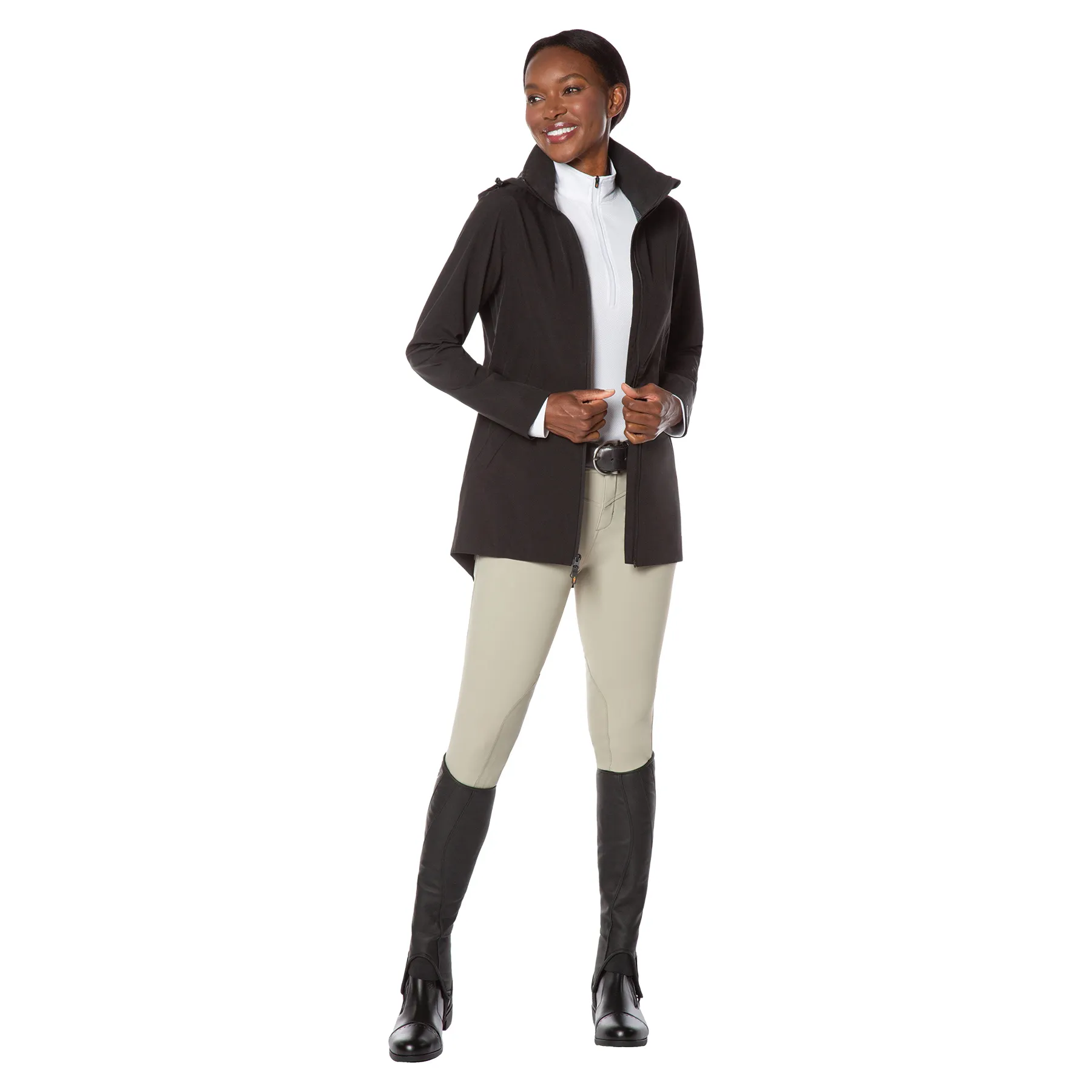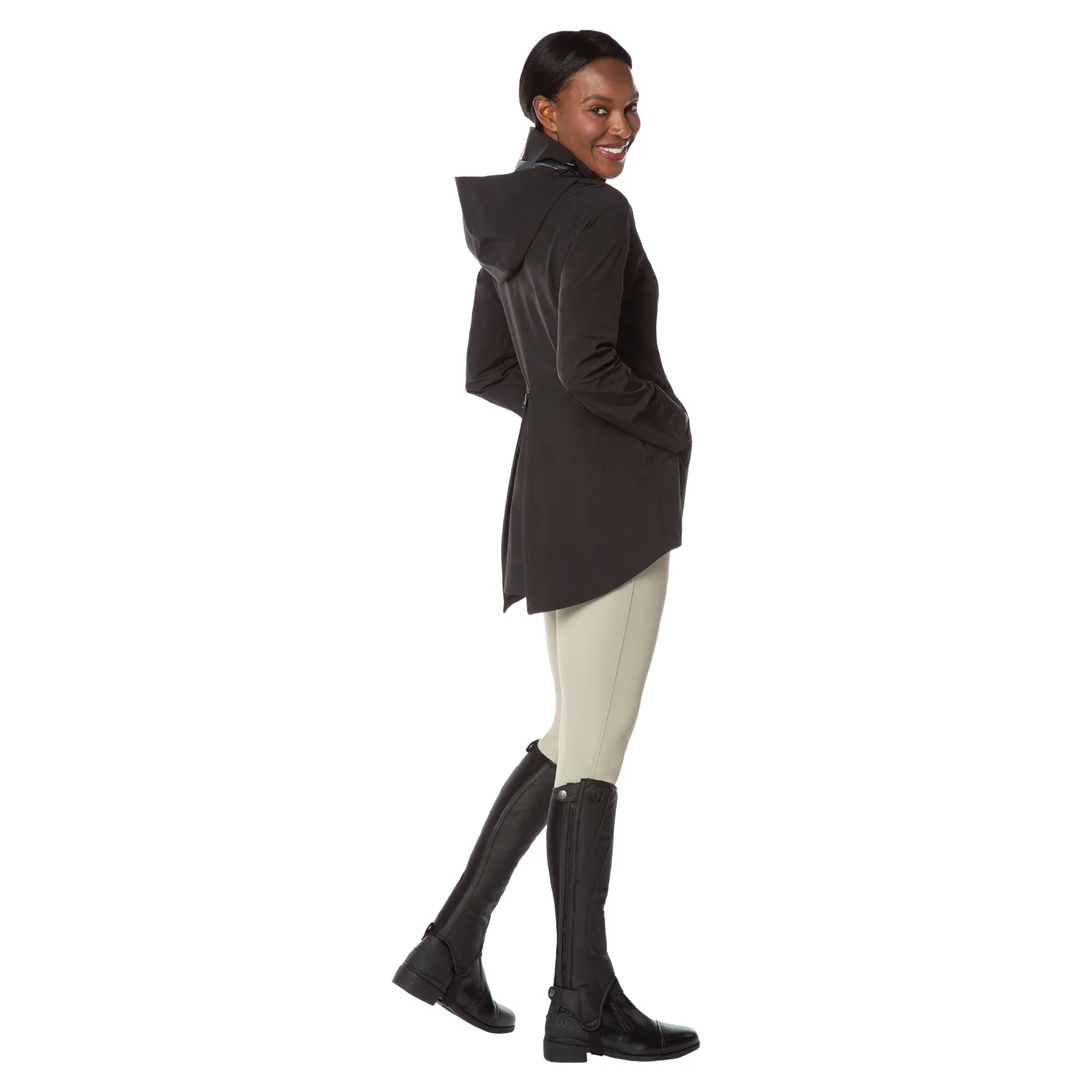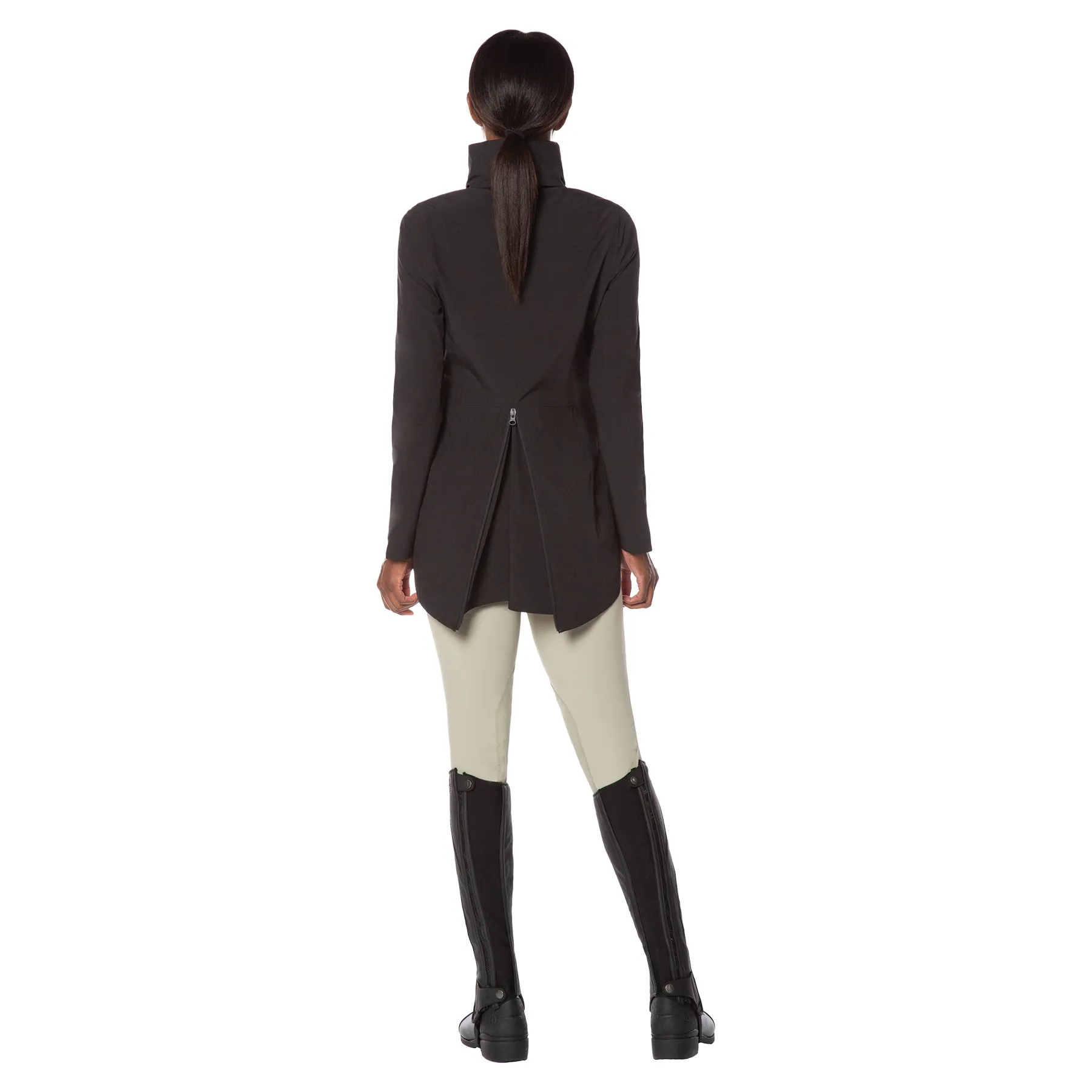 • Split-back hem zips open for saddle coverage