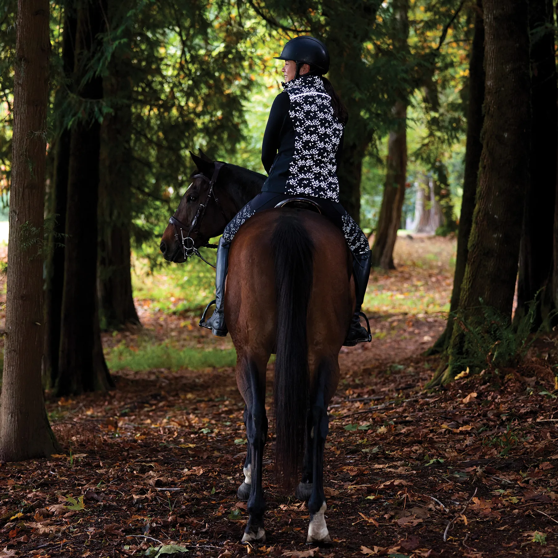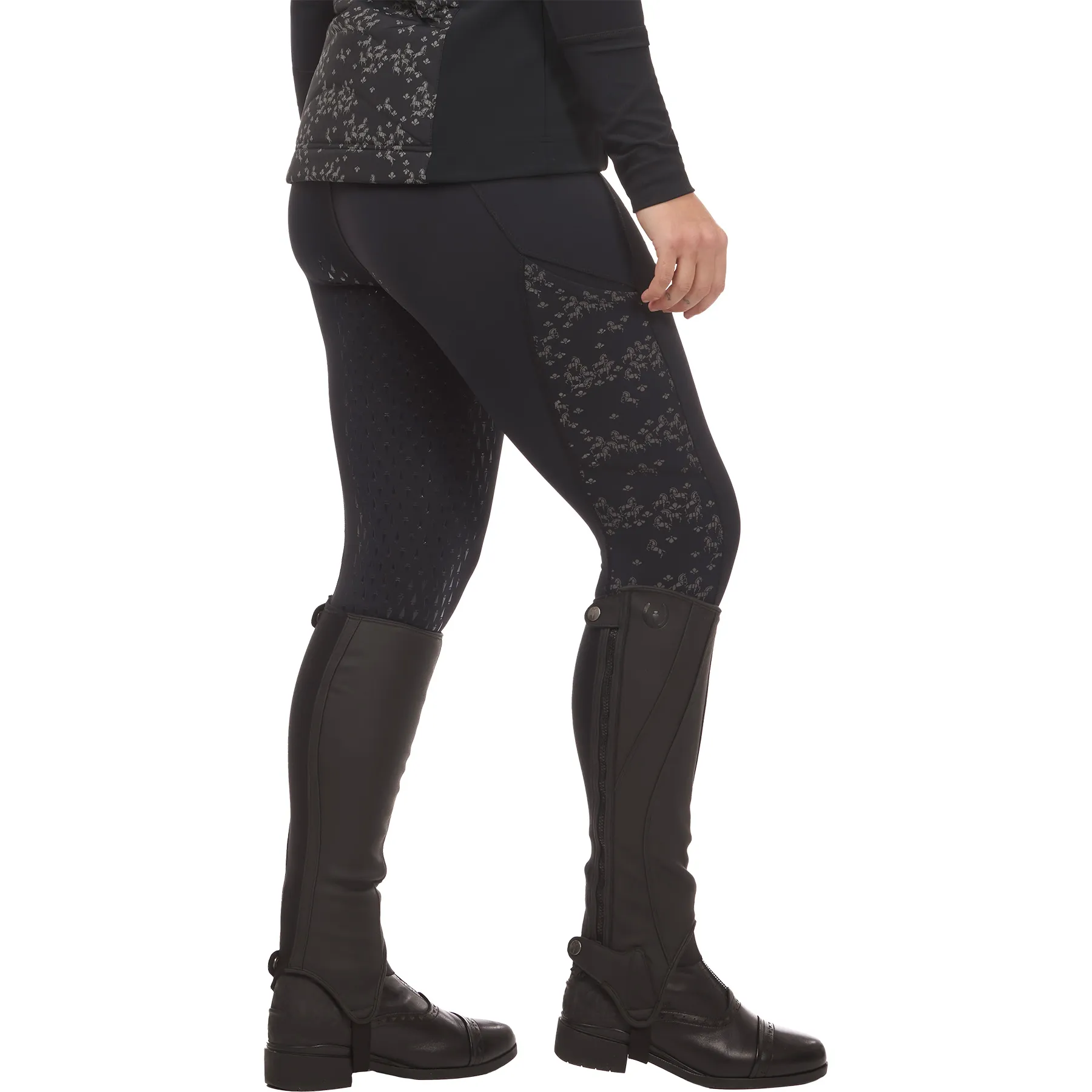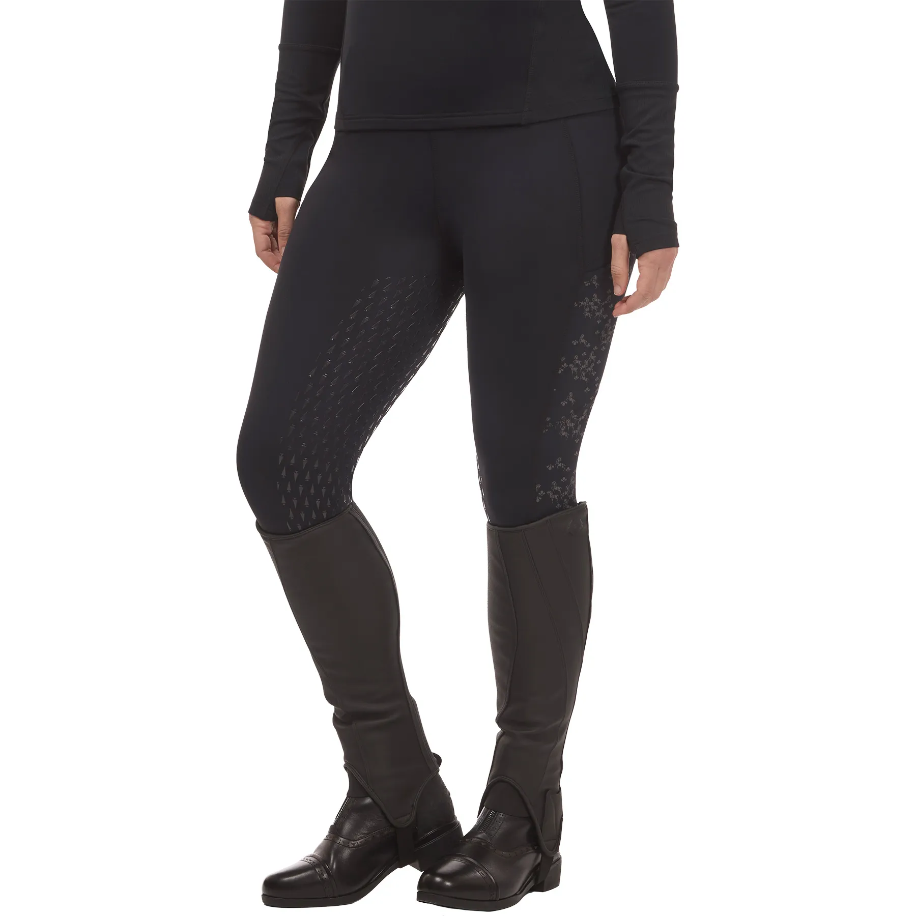 Slide into cool-weather rides with lightweight winter tights that blend warmth, flexibility, and visibility. The Thermo Tech™ knit keeps things cozy with a brushed interior and a smooth exterior that resists hay and horsehair. Reflective "Happy Herds" side panels add low-light visibility, while a high-rise waistband and four-way stretch offer support without sacrificing movement. With full-leg silicone grip and rider-friendly pockets, these tights are built to perform wherever your ride takes you.
