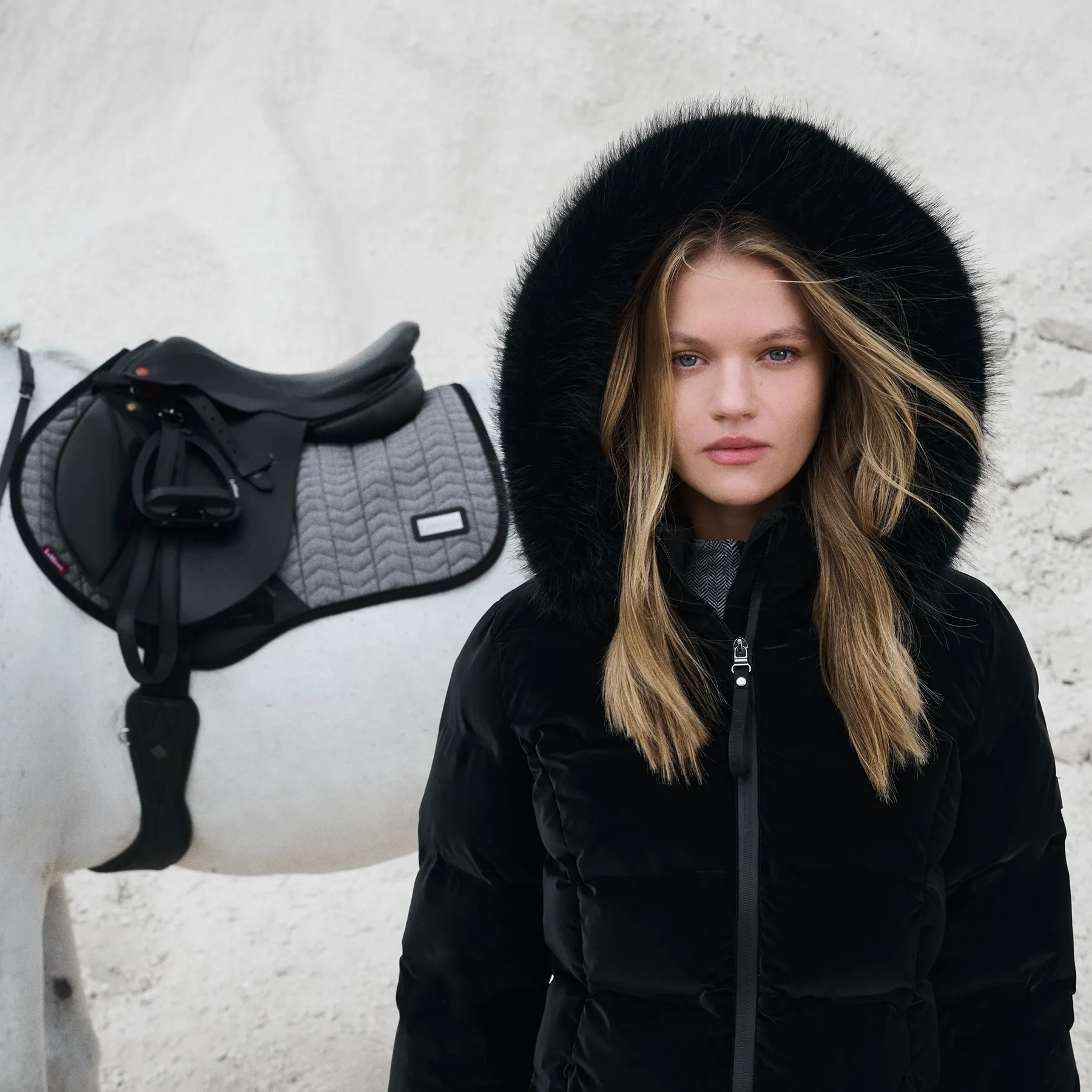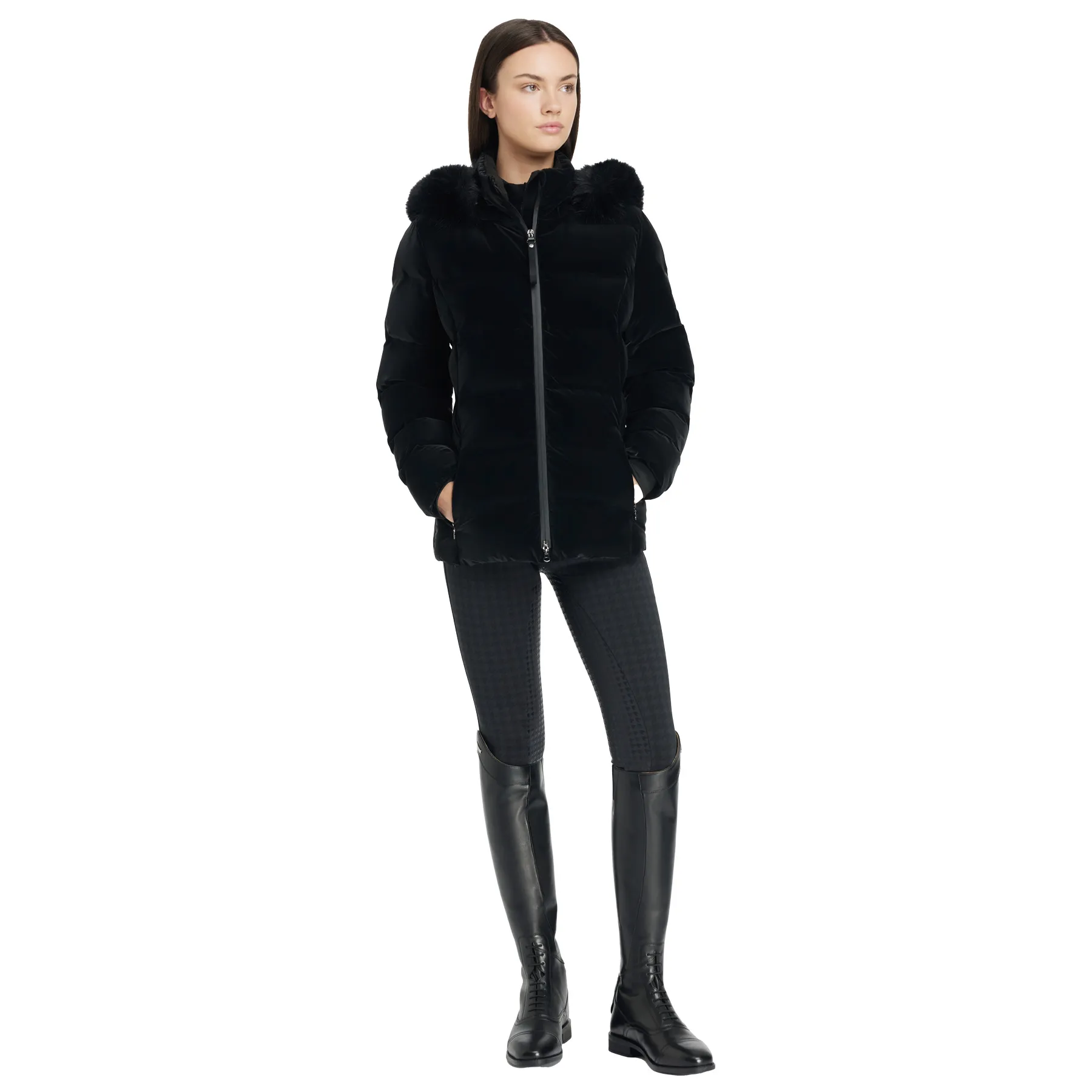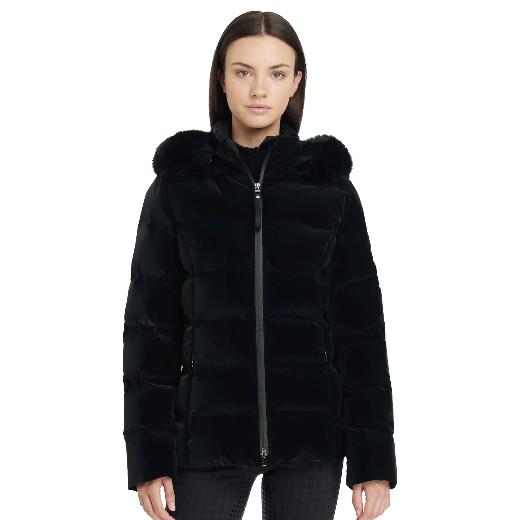 The LeMieux® Ladies Aspen Puffer Jacket blends luxurious comfort with practical performance, making it your go-to for chilly days in and out of the saddle. Made from soft-touch, velvet-look fabric with heat-welded baffles, this water-resistant coat is filled with sustainable DuPont padding that's lighter and warmer than traditional down. A detachable hood with faux fur trim, underarm zip vents, and cozy fleece-lined pockets elevate both style and functionality. This winter riding jacket is everything you need to stay warm while looking effortlessly polished.
