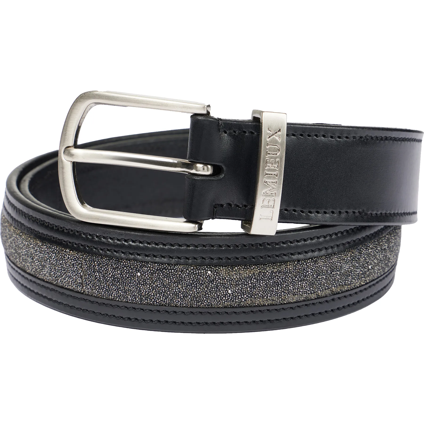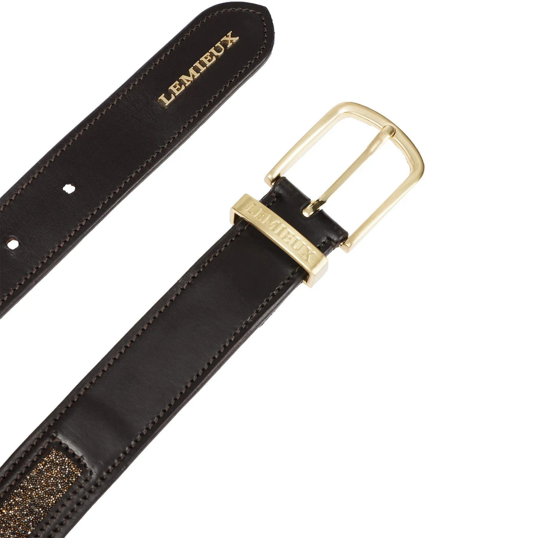 The LeMieux Ladies Crystal Insert Belt adds a touch of sparkle to your riding wardrobe while keeping your breeches perfectly in place. Crafted from premium leather and finished with tone-on-tone crystal detailing, it's the ideal mix of function and fashion. A satin-brushed brass buckle and raised LeMieux lettering polish off this elegant accessory.