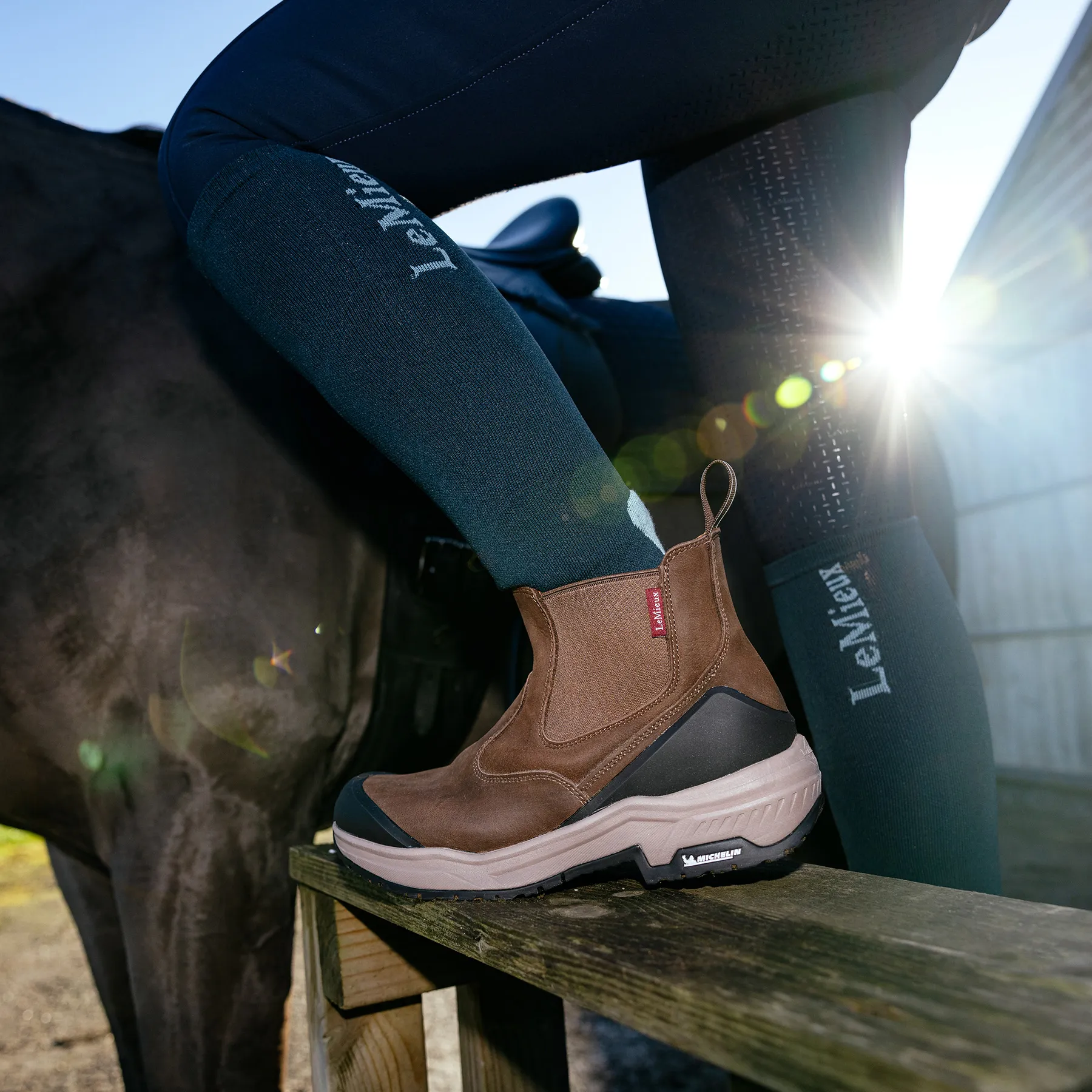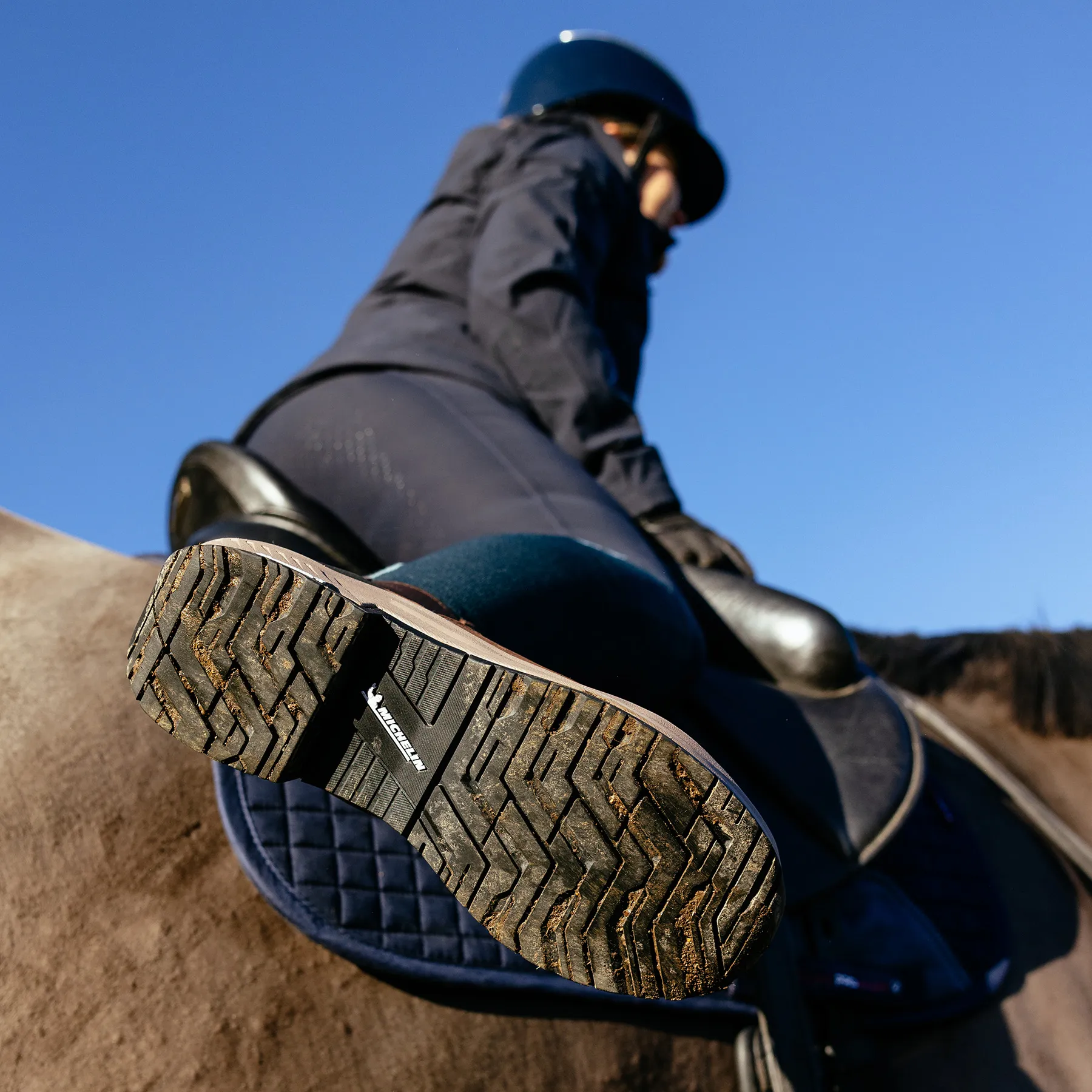 - Stirrup-friendly heel with durable Michelin rubber sole