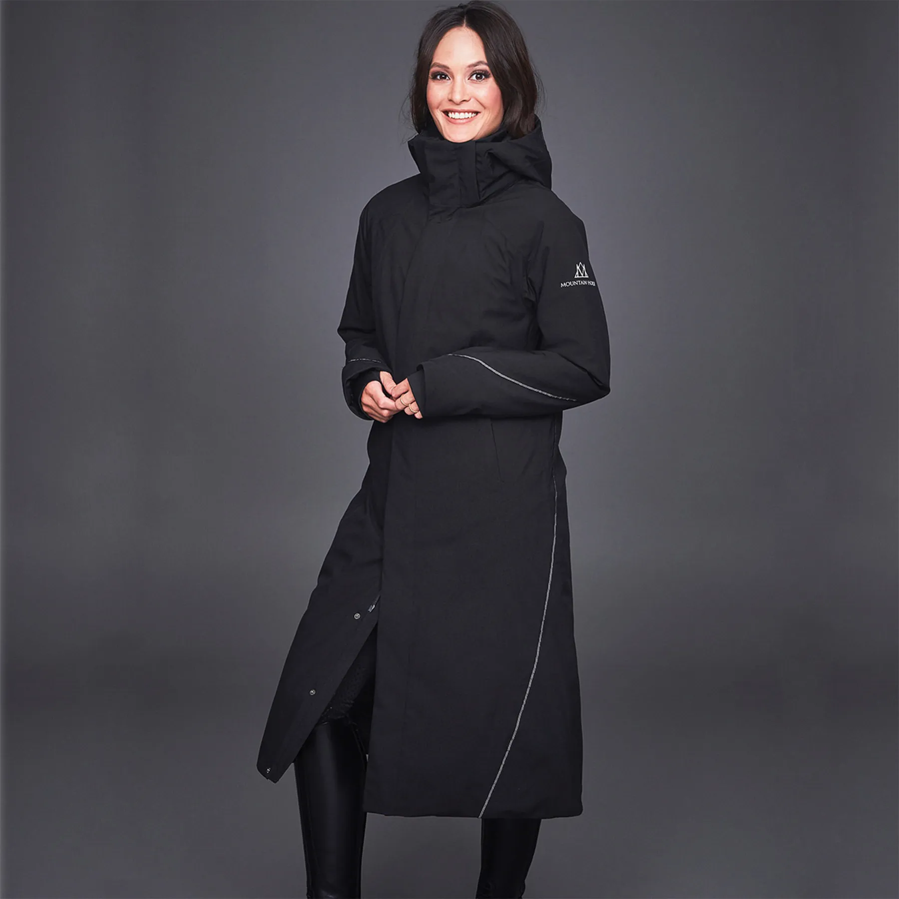 When you need a full coverage coat, reach for the Mountain Horse Alicia Coat. This long windproof coat will keep you warm on the ground or in the saddle. Ideal for trainers! It is lightweight, waterproof and breathable. It has a two way zipper with a riding slit at the back and a detachable hood.Long - mid calf