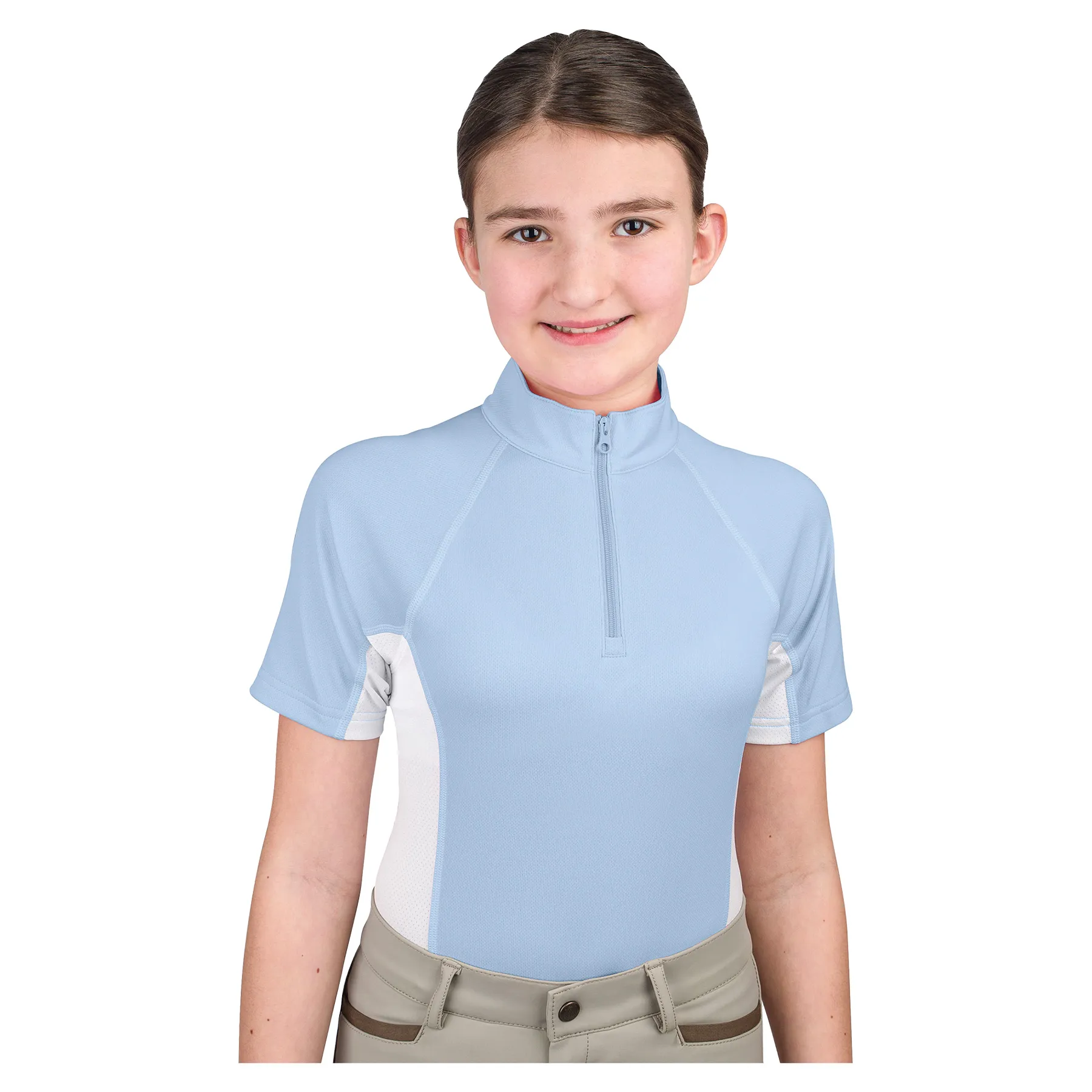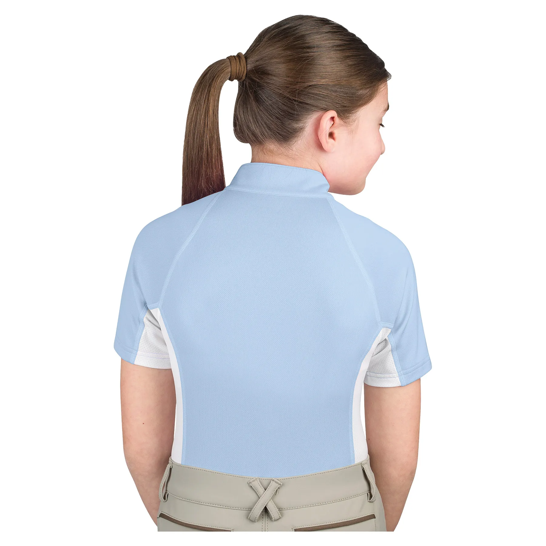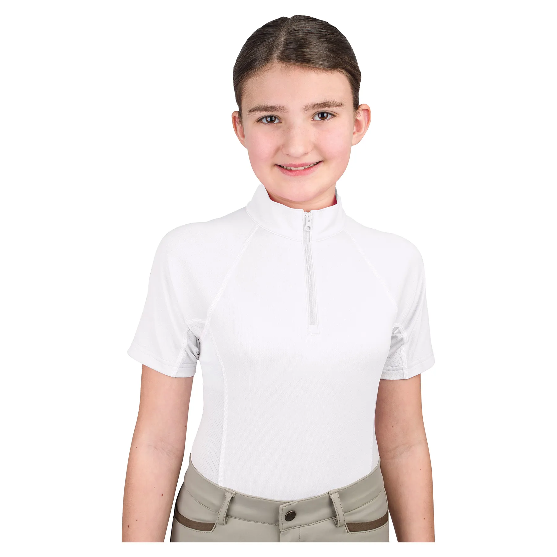 Keep your young rider cool and sun-safe with the Ovation Kids Quarter Zip Short Sleeve SunShirt. With its classic equestrian style and functional design, this shirt features a tab collar, short sleeves, and a sporty quarter zip. Cooling mesh contrast side panels boost breathability, while the anti-wrinkle UV 50+ fabric shields skin from the sun. Made from 100% recycled polyester, it's a smart choice for eco-conscious riders.
