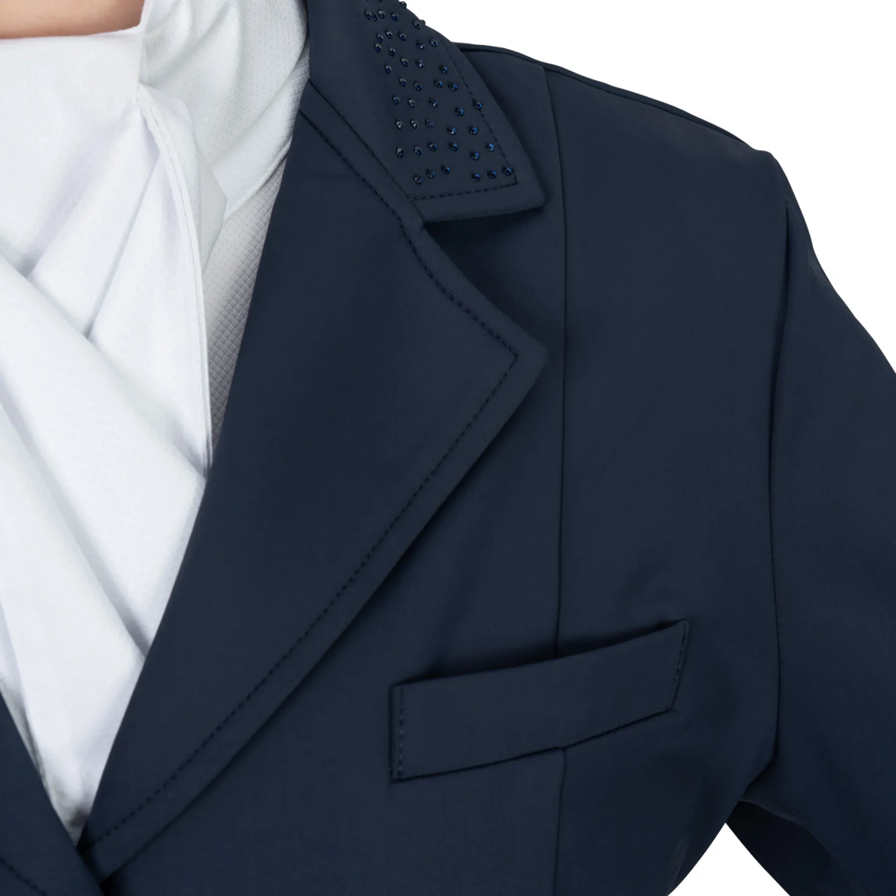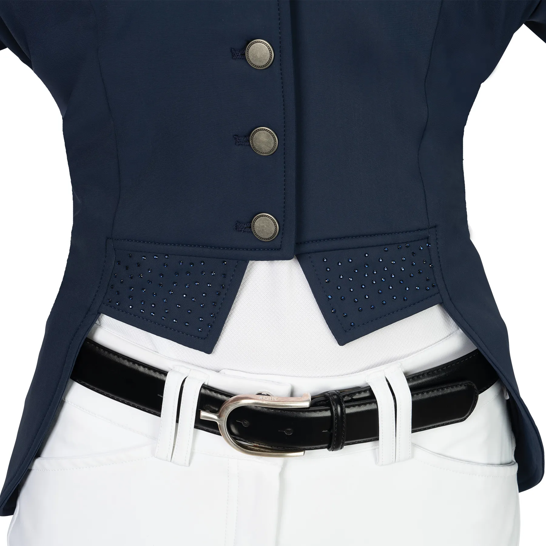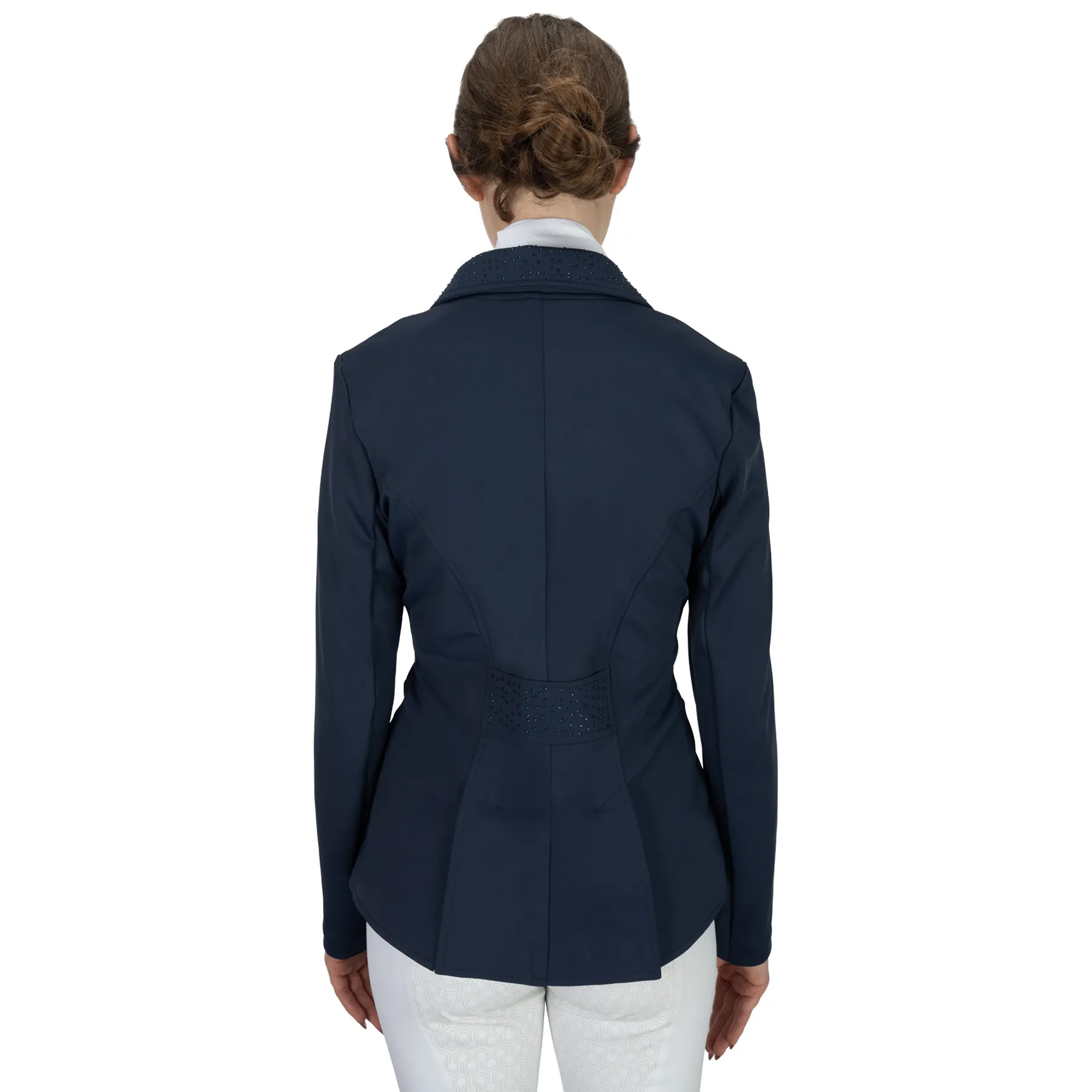 Show off your elegant side with the Ovation Ladies Dressage Show Coat—a lightweight, performance-driven piece designed to move with you. Crafted with 4-way stretch fabric for freedom in the saddle, this coat features quick-drying material to keep you cool under pressure. Thoughtful details like a double back vent and tonal crystal accents on the collar, hem, and bow add a subtle sparkle while maintaining a classic look. Fully lined for comfort and structure, this coat is ready for your next dressage test.