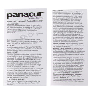 Panacur® (Fenbendazole) Paste 10% contains the active anthelmintic, fenbendazole. Each gram of Panacur® contains 100 mg of fenbendazole and is flavored with artificial apple-cinnamon liquid. Used to treat large strongyles, small strongyles and pinworms.