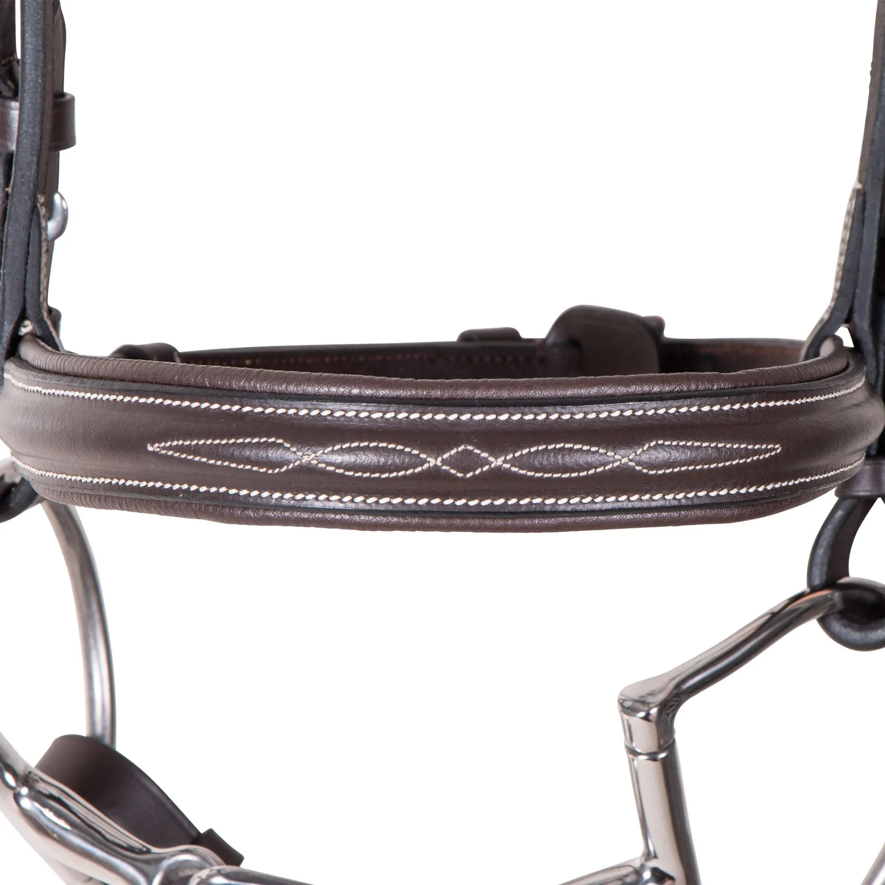 Hand-crafted in the British tradition, this stylish English bridle has a 3/4" wide raised, padded browband and cavesson, providing ultimate comfort for your horse. The bridle includes a fancy stitched design on the browband and noseband, proving that comfort doesn't have to sacrifice style. Your horse will be comfortable and stylish, whether schooling or in the show ring.