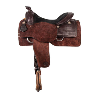 The Basketweave Tooled Roughout Saddle showcases superb craftsmanship. This saddle perfectly combines work and show, crafted from the finest hand-selected hides. It features a beautiful combination of roughout and finely hand-tooled, pre-oiled leather with basketweave tooling and antiqued conchos featuring silver-plated trim. All Billy Royal® saddles are built on our custom-made wooden trees, designed to fit modern conformations from Arabians to Quarter Horses. The saddle comes with a lifetime warranty on the tree, a Latigo cinch strap, an off-billet, and rawhide-wrapped stirrups.