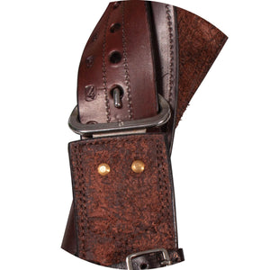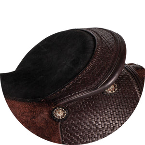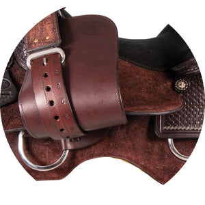 - Basketweave tooling and antiqued conchos with silver-plated trim