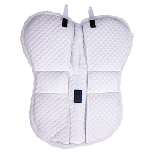 The Dura-Tech® Verashim Fleece Lined 6 Pocket Shim Half Pad is designed to offer a custom fit for even the most challenging of horse shapes. This shimmable half pad eliminates wither pressure and does not restrict shoulder movement. It is made from a soft, durable, quilted cotton top and fleece with layered foam, wool felt, and crush-proof memory foam. The pad features six pockets and comes with three sets of varying shim thicknesses (18 shims total), allowing you to tailor the fit precisely. The cut-away wither design eliminates pressure and promotes free shoulder movement. With a center spine length of 23 1/2" and a side length of 25", this pad fits most saddles. It can be conveniently attached to saddle D's with small front hook and loop closure tabs. Machine washable and available in white, this pad offers both practicality and style.