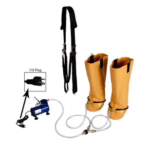 - Includes 2 boots, suspenders, boot hoses, 110 Volt compressor, compressor hoses, and compressor attachments