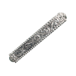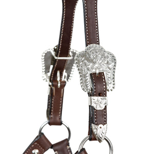 Full silver plating over the nose, and cheeks. Cheek buckle measures 2 1/4" wide x 2 1/4" high with matching keeper at tip. A nice quality hand tooled silver show halter for the entry level horseman.