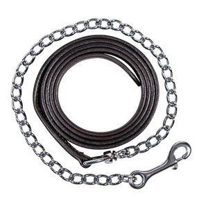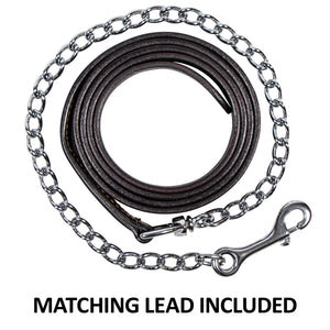 Comes with a 1' wide leather lead with a 30" chrome plated chain.