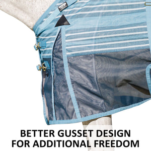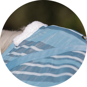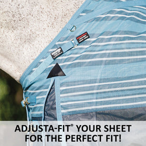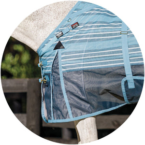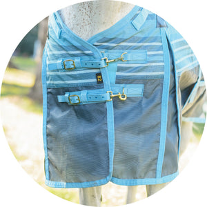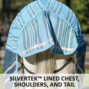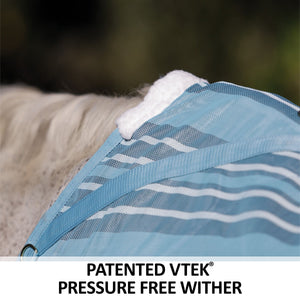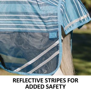 Your favorite, most durable fly sheet is back with a new modern, blue-striped design, reflective stripes, and SilverTek® technology with antibacterial nylon lining on the chest, shoulders, and tail. The VTEK® Wither Relief fit and Bellyband closure give low to moderate-withered horses the ultimate protection. The durable 1000D heavy polyvinyl-coated mesh withstands the rigors of turnout, perfect for those horses that play rough in the pasture, and it shields your horse from sun damage with 70% UV protection. With this durable sheet, your horse will be protected from medium to large-sized insects, such as deer flies, greenheads, and horse flies. It’s available in multiple fits with features that prevent rubbing, offer unbeatable protection, and include a 3-year warranty. Don’t forget to complete the look with the matching neck cover and boots.