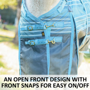 The open front design features double front snaps with new and improved wider hook and loop closures, allowing you to easily adjust the fly sheet for the perfect amount of “snugness” at the front of the chest. Plus, the snaps make it easy to put on and remove.