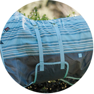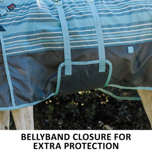 The bellyband closure protects from flies and midges biting along the sensitive underbelly line. Brass-plated hardware is positioned to avoid rubbing or poking while your horse is lying down, and the rear surcingle includes a stretch panel for more give as the horse moves since the proper fit is with the bellyband snug and flush to the belly.