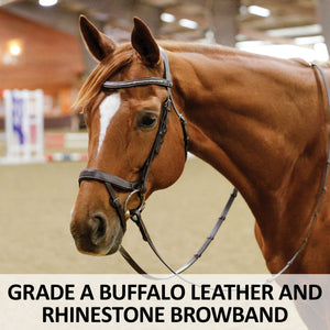 Made from soft yet durable Grade A Buffalo leather, this bridle is built to withstand daily use while maintaining its luxurious feel. The rhinestone-encrusted browband adds a touch of sparkle, making your horse stand out in any arena while showcasing timeless elegance.