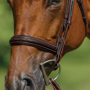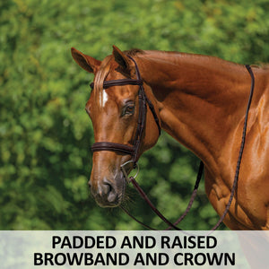 This bridle boasts a padded and raised browband and crown, to provide extra comfort for your horse. The elegant design features decorative stitching on a 1" wide noseband and browband with raised areas that add a touch of sophistication. The noseband also tapers seamlessly to the chin strap, creating a sleek and stylish profile that will impress.