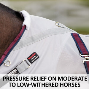 Tears and snags are bound to happen, but this VTEK® Wither Relief RipGuard Fly Sheet with a bellyband closure is the best self-repairing sheet available. It's available in three fits for all wither types and even senior horses. The advanced diamond interwoven mesh works like magic when it self-repairs against snags that could later turn into tears. When you see a snag, you simply rub the fabric between your hands to repair the fabric. Designed for horses that like to play hard in the pasture, these sheets deliver fantastic protection against small to medium-sized insects, such as gnats and flies. Plus, the 70% UV protection rating keeps them safe from the sun.