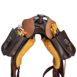 This beautifully crafted leather horn bag keeps your trail essentials within easy reach. Made from hand-tooled Argentine leather, it fits snugly over your western saddle horn and offers ample storage for your phone, water, snacks, or medical supplies. Designed for convenience and style, this horn bag is perfect for any trail ride.