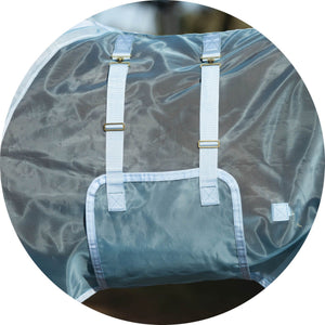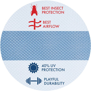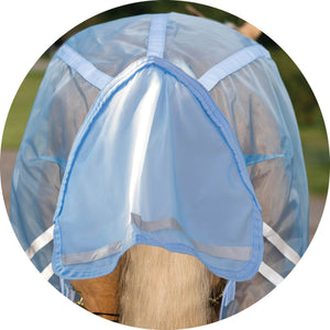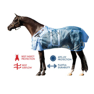 This fly sheet is the best for insect protection and airflow. The 350D extra fine “window screen” nylon mesh protects against the widest range of biting insects, such as tiny gnats, mosquitos, and flies. It’s extremely breathable and stays cool in direct sunlight, providing 40% UV protection. The fabric withstands playful turnout, making this perfect for your horse to wear all summer with a 2-year warranty!