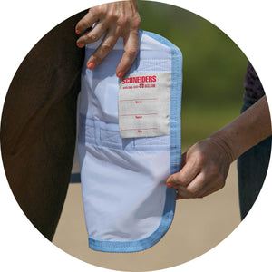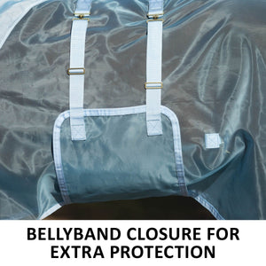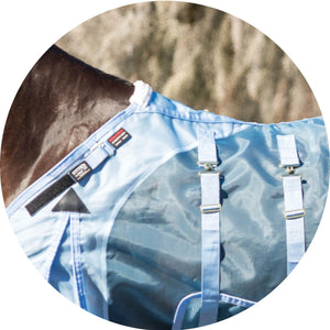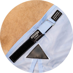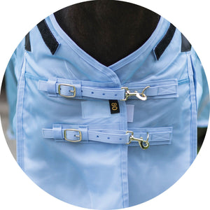 The bellyband closure option protects from flies and midges biting along the sensitive underbelly. Brass-plated hardware is positioned to avoid rubbing or poking while your horse is lying down, and the t-post hardware on the bellyband closure includes locking bands and incorporates elastic inserts for more give as the horse moves since the proper fit is with the bellyband snug and flush to the belly.